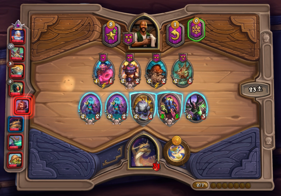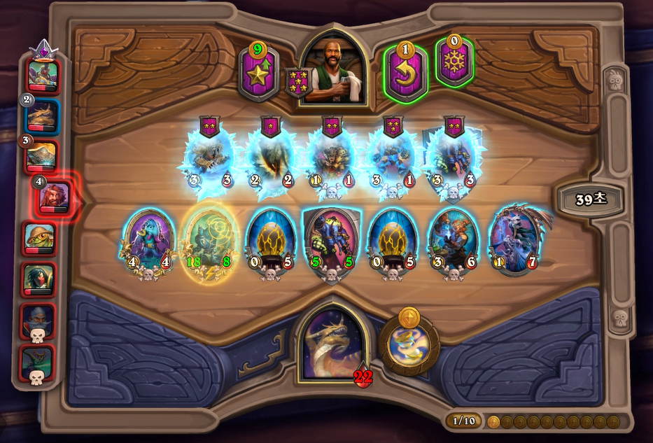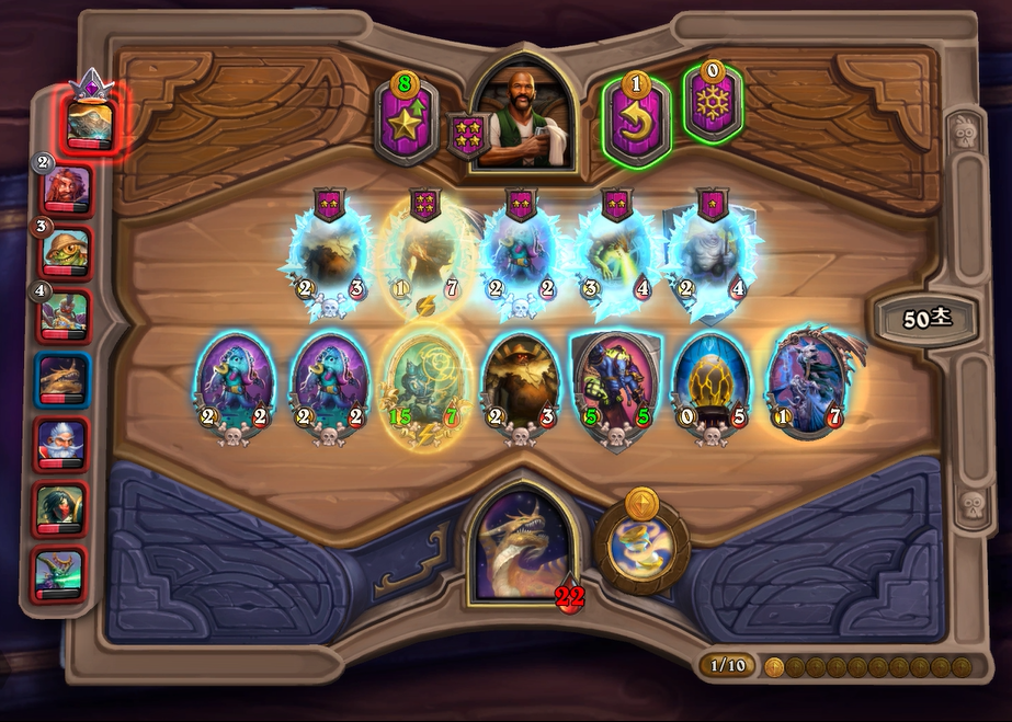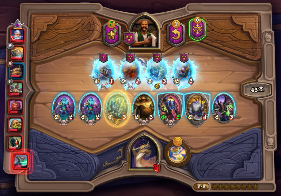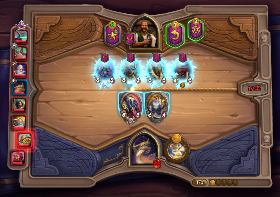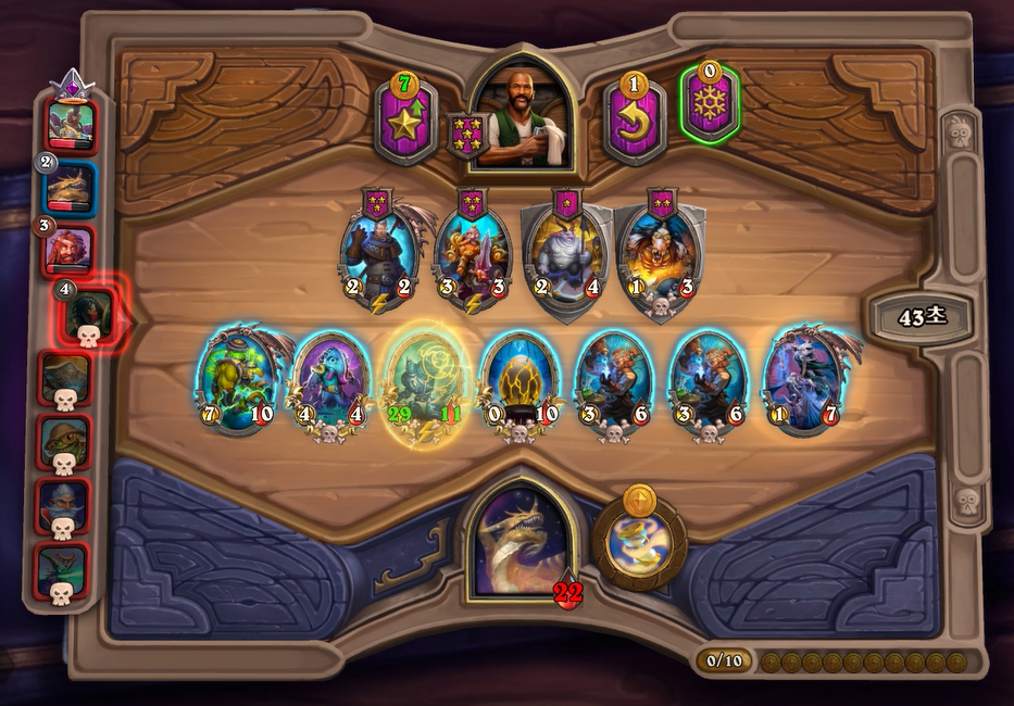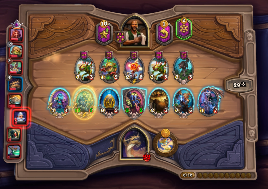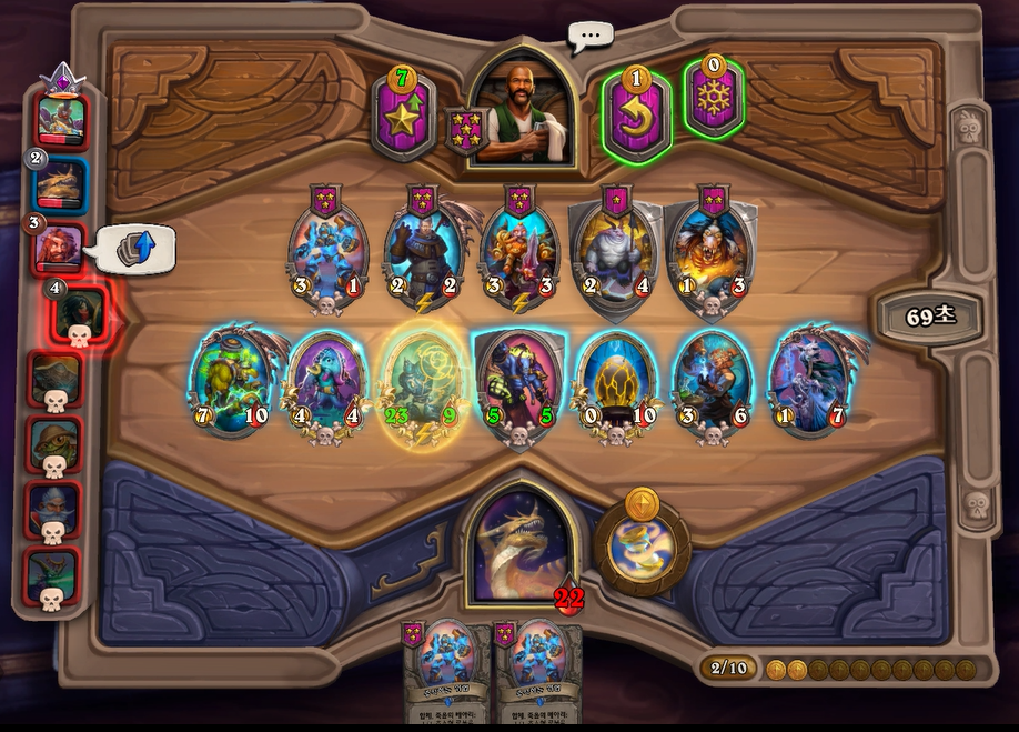 이번 하수인 상점에서는 전턴에 얼렸던 느조스의 피조물을 구입하고, 리롤을 해서 나스레짐을 구입했습니다. 악마간수를 살까 고민했었는데, 페어 욕심보다는 저는 버프 욕심이 좀더 많아서 이런 플레이를 했습니다. 배치도 라팜이라 고민했는데 설령 느조스를 주더라도 이기는게 중요하기 때문에 위 스크린샷과 같이 하수인 배치를 했습니다.