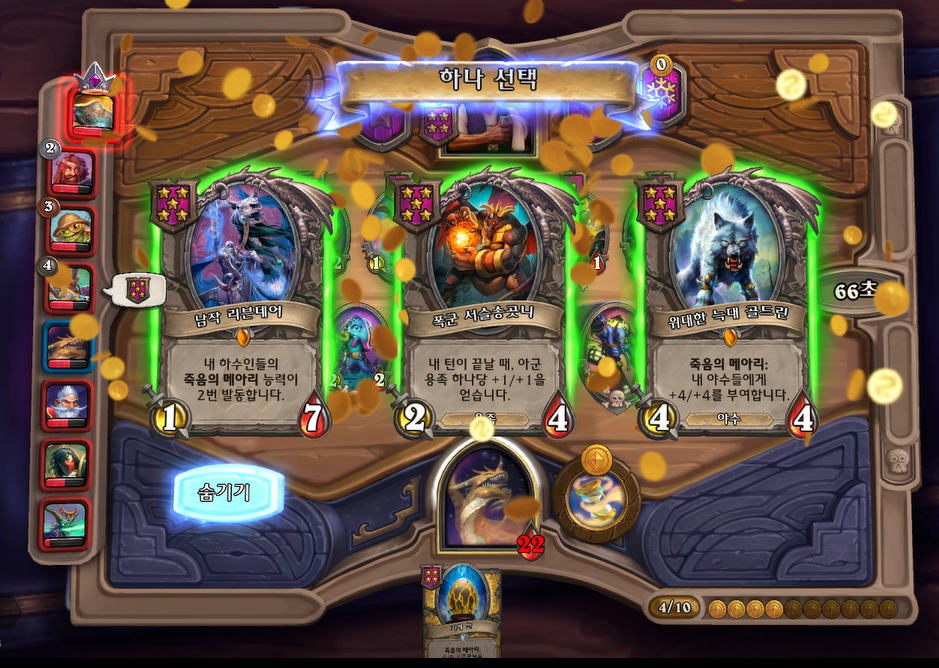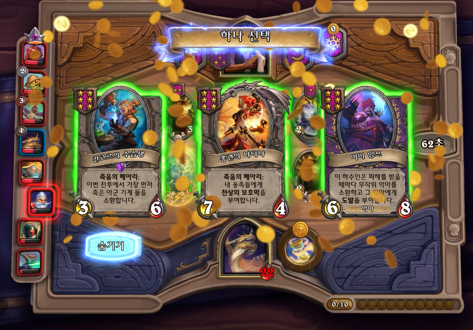 9턴에서는 느조스의 피조물을 황금카드로 만들고 6성 발견을 통해 칸고르의 수습생을 찾았습니다. 이정도면 죽메기계덱 근본이 모였기 때문에 순위방어가 확실해졌다고 생각했습니다. 다음 상대는 밀하우스 마나스톰인데, 마나스톰도 이제는 3골드로 시작 할 수 있어 이전보다 상향되었다고 생각합니다. 3골드 시작시에 토큰을 구입하고, 다른 하수인을 추가적으로 살수 있어 초중반이 쏀 영웅이 되었다고 생각합니다.