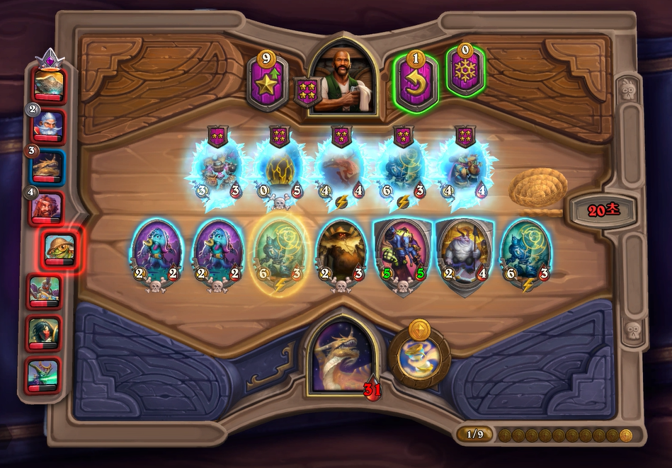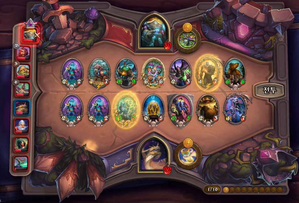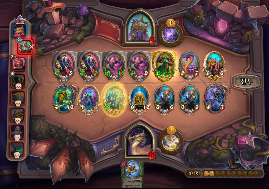 제가 좀더 쎄다고 생각했는데, 상대가 이득교환을 너무 잘해서 9데미지를 받았습니다. 이번 패치에서 필드에 보시는 것처럼 사바나 사자가 4성이 되었는데, 중반 타이밍에 약한 야수덱의 상향이라고 볼수 있을 것 같습니다.