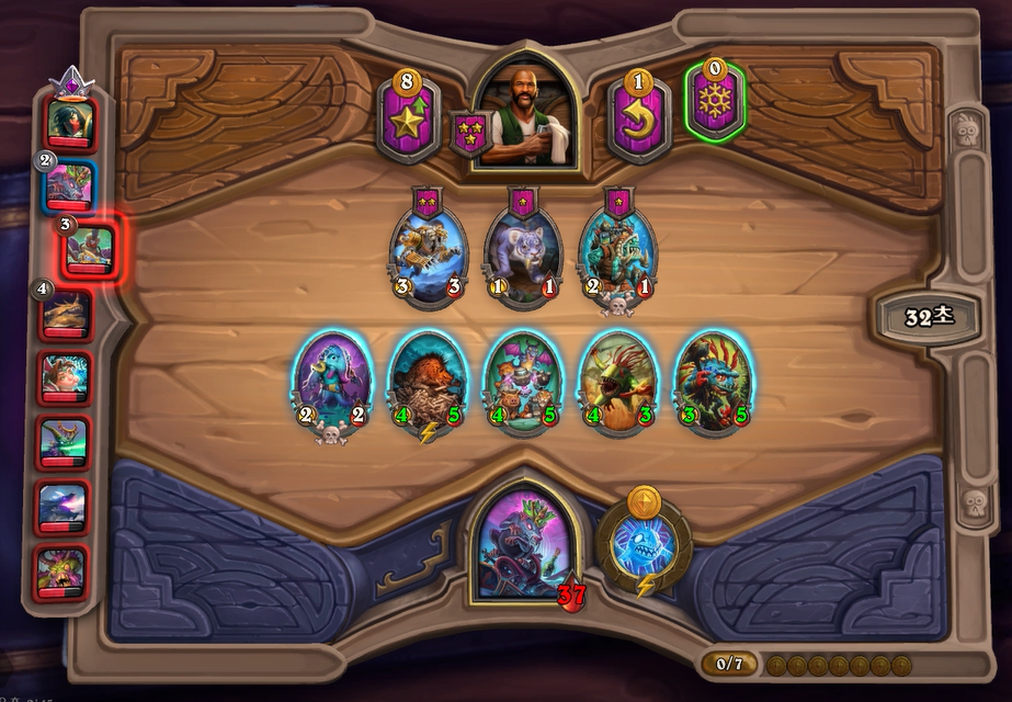 8턴하수인 상점입니다. 무리 지도자와 기계 알을 구입했습니다. 중반타이밍에 야수가 많이 약해서 이제부터는 내리막길이 될 확률이 높습니다. 지금은 1등이지만, 페어를 빠르게 보거나 과감하게 레벨 업을 해야만 4등안에 들어갈 것 같습니다.