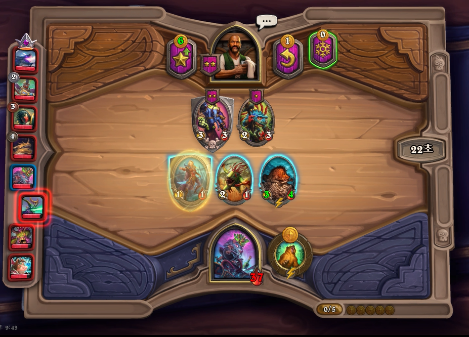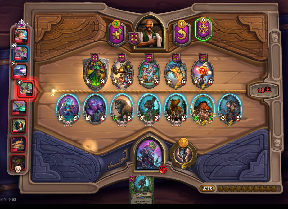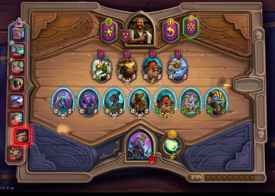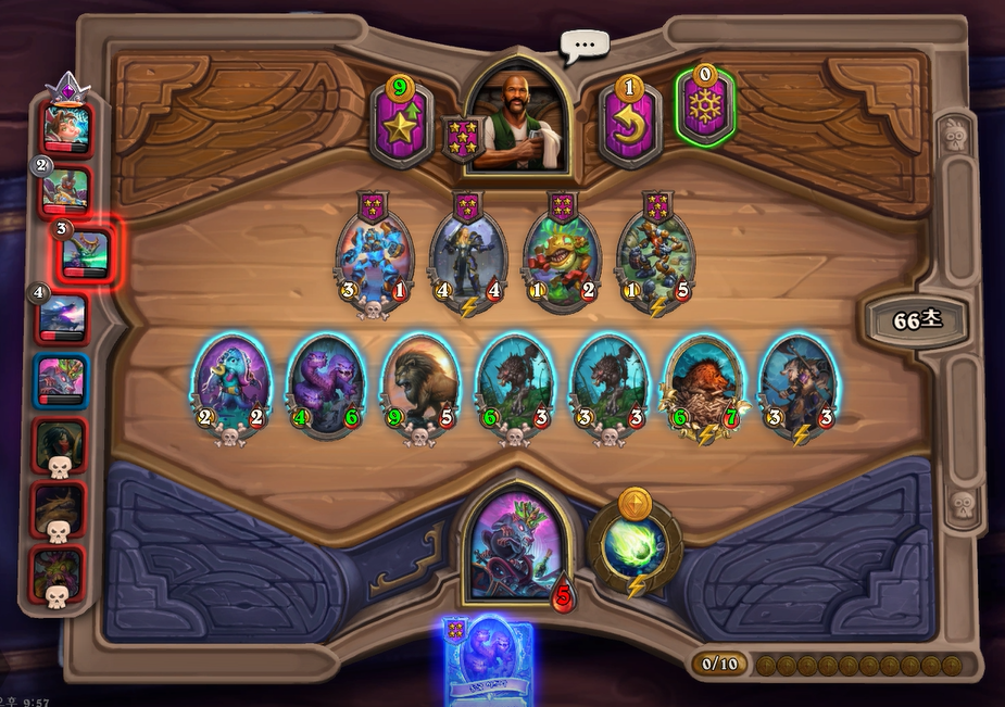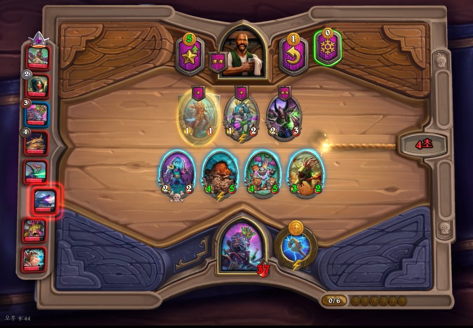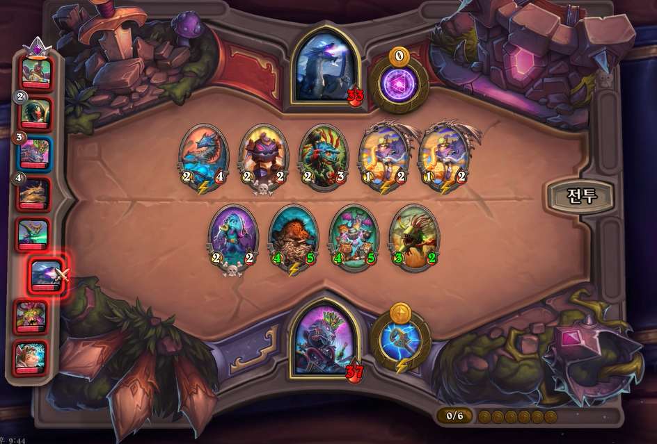 6턴 하수인 상점에서 하이애나 2개가 나와 4성 발견을 했습니다. 부릉이나 박물관 마술사가 지금 쎄지만 야수 빌드업을 고려해서 히드라를 구입했습니다.