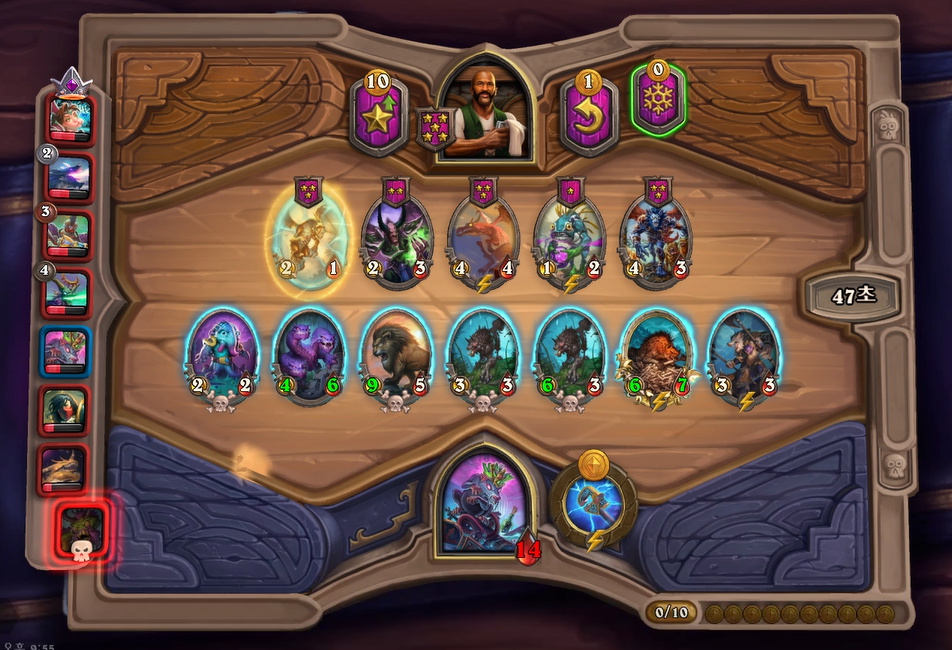 왕쥐는 초반에 영웅 능력에 맞는 종족값 하수인들을 사면 매우 강해서 쉽게 지지않습니다. 특히 1턴은 백수의 왕이 확정이므로 길고양이, 늑대 우두머리를 시작하는것이 가장 좋습니다. 심지어 기계의 왕 상태에서 콩콩이를 사도 스탯이 2/3이 되기때문에 정말 살게 없으면 콩콩이를 사셔도 될정도로 영능 능력이 다시 좋아졌다고 생각합니다. 이번 판에서는 망했다고 생각했는데, 운이 좋게 2명이 함께 죽어 공동 3등을 했습니다. 그럼 지금부터 왕쥐 플레이 리뷰를 시작하겠습니다.