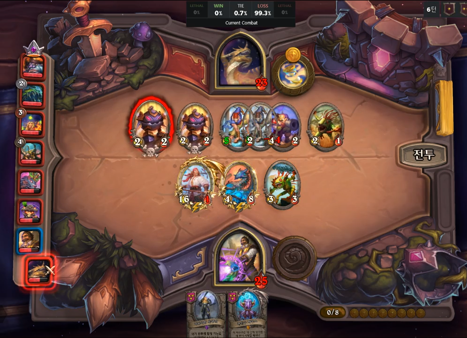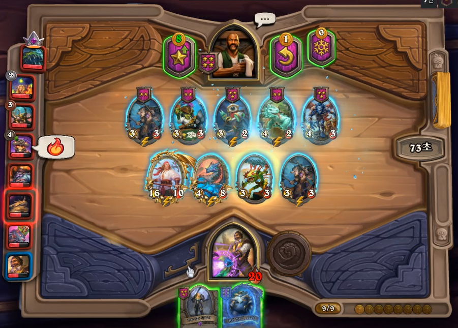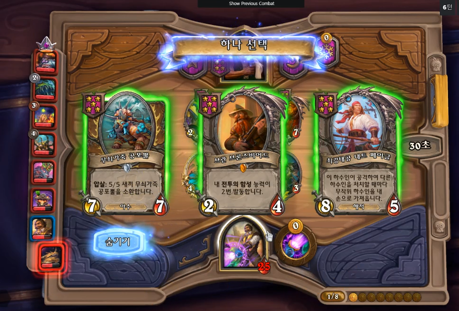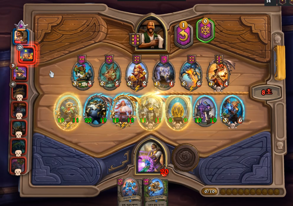 간단하게 리노 잭슨 플레이에 대해 리뷰를 해보겠습니다. 위 스크린 샷 같은 경우는, 황금 청동 감시자를 맞춘 후, 선상 도박꾼을 팔아 8 골드 타이밍에 5성 하수인을 발견했습니다. 당연히 브란을 선택하는 것이 맞지만, 체력이 25밖에 없다는 생각에 내트 페이글을 선택했습니다. 이 플레이는 꼭 정답이 아니고, 지금 돌이켜봐도 브란을 선택하는 것이 나았겠다고 생각합니다.