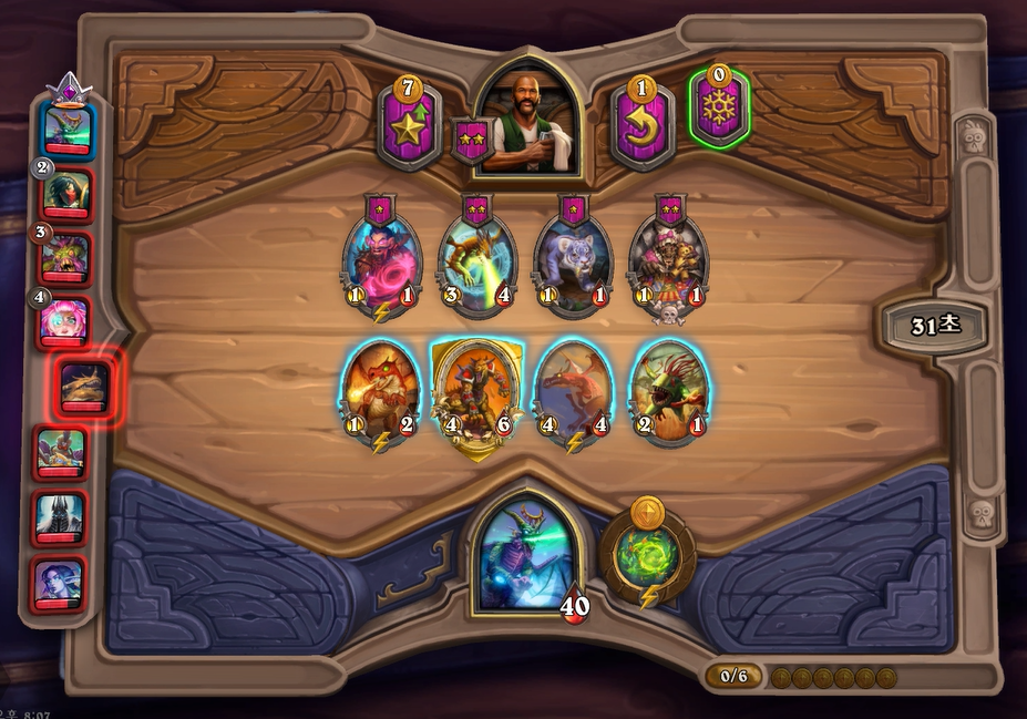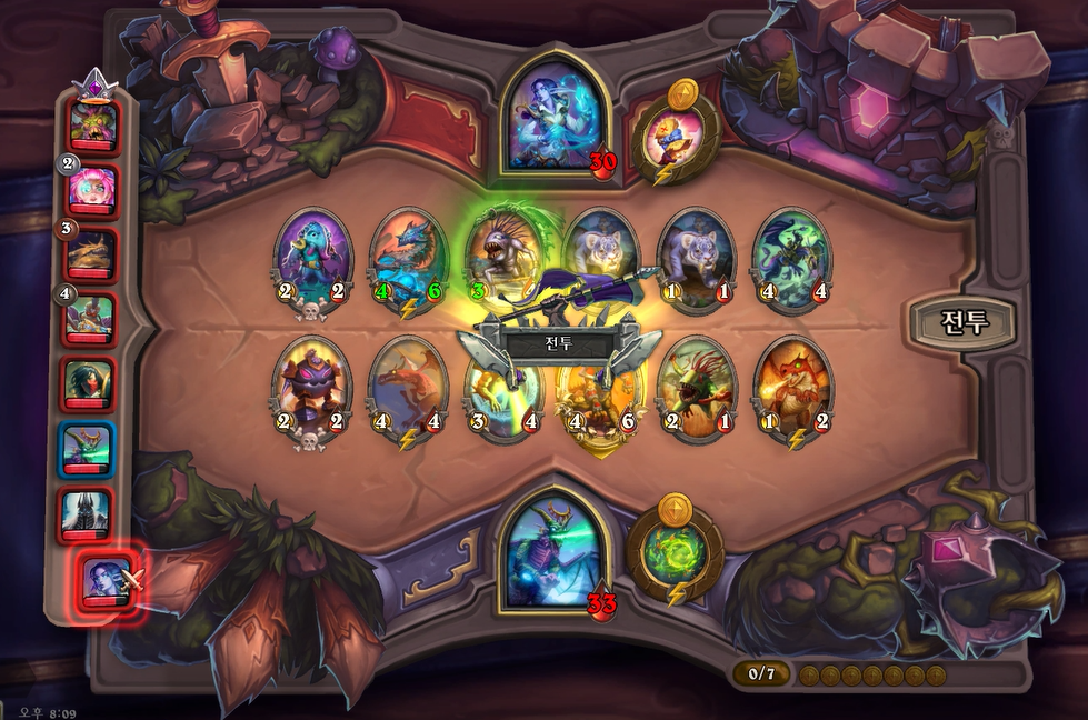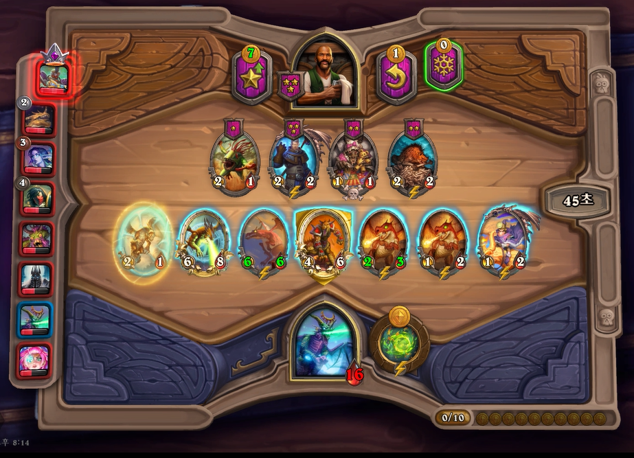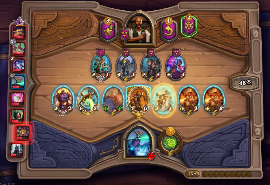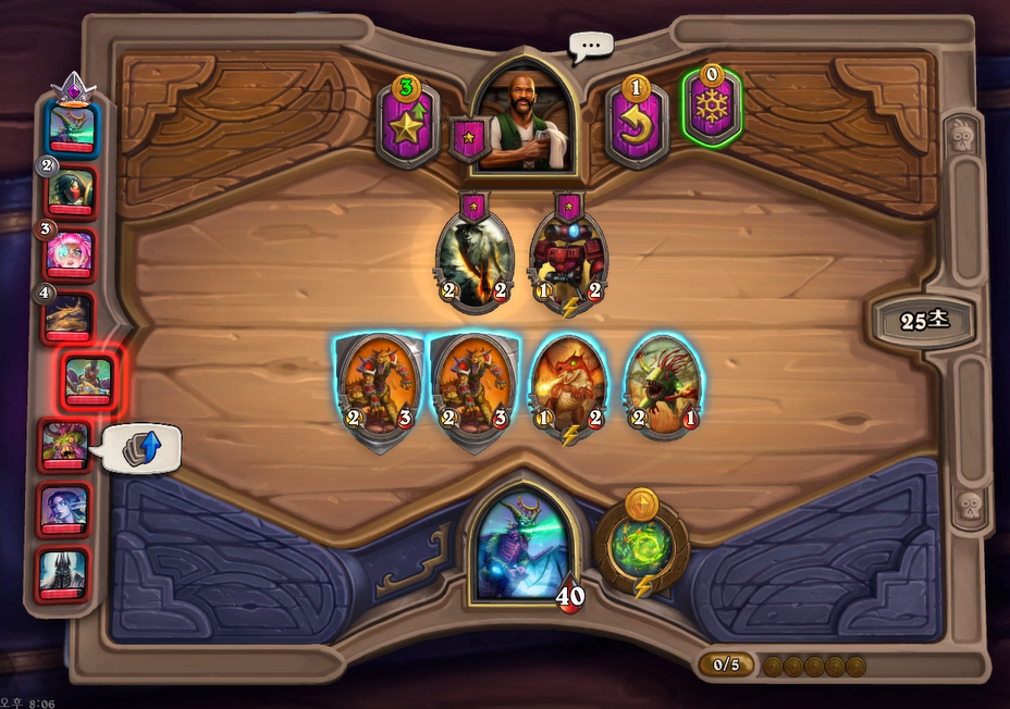 8턴 하수인 상점입니다. 추가되는 용족 성능이 낮다보니 필드가 계속 강해지지 않았습니다. 이세라의 단점이 여기서 나오는 것 같습니다. 초반에 위력적이지만, 용족자체가 중반에 약하기 때문에 레벨 업 속도를 올려야했는데, 그러지를 못 했네요.