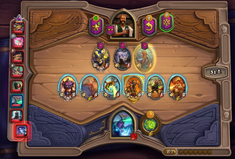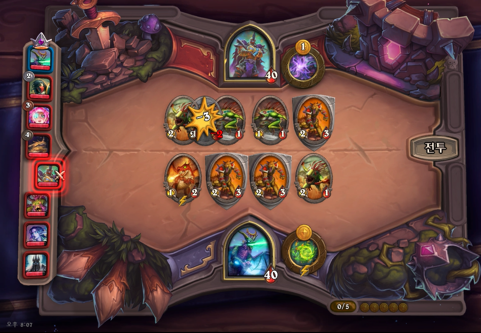 2턴 하수인 상점입니다. 여기서 고민되는 부분이 레벨업과 용족 구매였습니다. 저는 용족 황금 카드 각을 보려고 붉은용을 구매했습니다. 그리고 한가지 말씀드릴것이 위 스크린샷처럼 1성 하수인이 3마리 보여도 멀록 바다사냥꾼이나 길고양이가 아니면 웬만해서는 얼리거나 사지 마시기 바랍니다. 1성 하수인을 황금카드로 만들어도 효율이 좋지 못하고, 초반에 골드 사용이 매우 중요합니다. 저렇게 늑대 3마리를 사려면 2턴을 버텨야하니까 매우 매우 비추천합니다. 2턴 전투는 상대가 레벨업 했으므로 전투 스크린샷은 생략하겠습니다.
