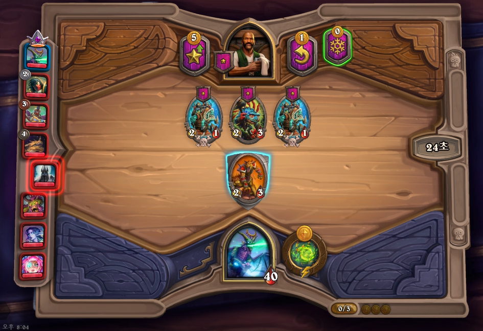 3턴 하수인 상점입니다. 멀록바다 사냥꾼 구입 -> 토큰 판매 -> 용족 부관 구입을 했습니다. 멀록바다사냥꾼과 같은 토큰이 뜨지 않았으면 레벨업 플레이가 좋습니다.