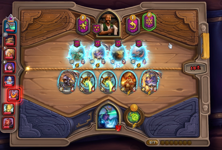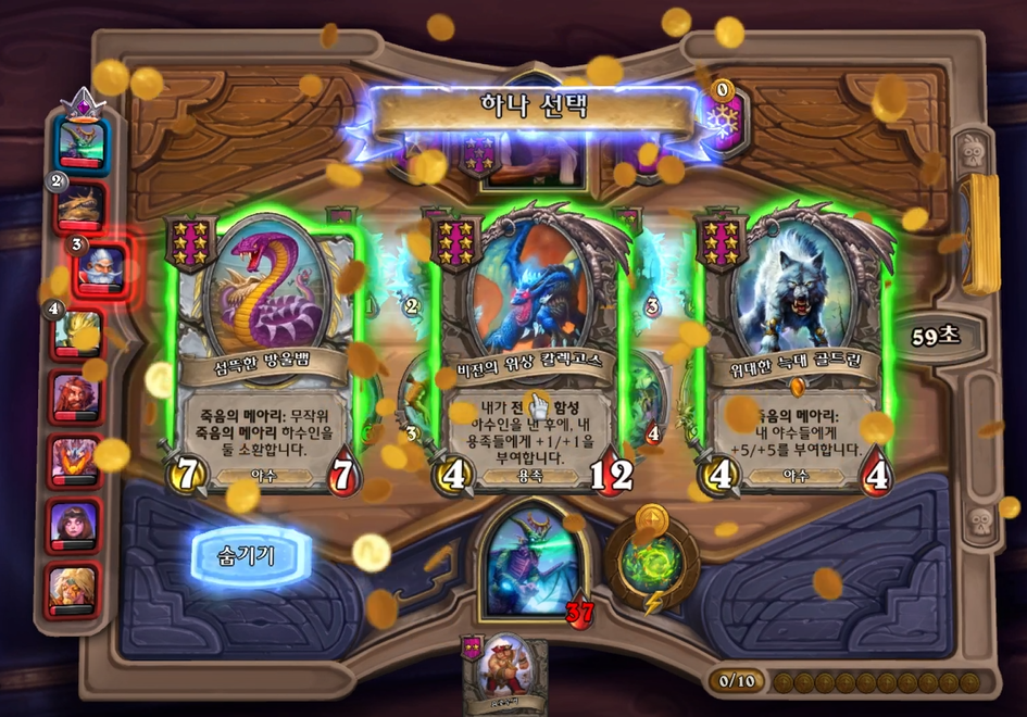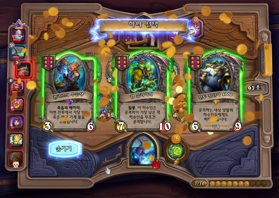 7 턴 하수인 상점입니다. 이렇게 페어가 또 나오면 레벨업 하고, 다른 하수인을 구매해줍니다. 1장 정도 5성 발견하는 것이 나쁘지 않다고 생각이 들 수 있지만, 칼렉고스 2장 뽑으면 우승이기 때문에 저는 한턴 더 참았습니다. 필드도 약해 보이지만 토그왜글이 쑥쑥 크면 충분히 할만하다고 생각했고요. 그리고 구매한 하수인은 내지 않습니다. 다음 턴 레벨업 + 하수인 구매를 하려면 11 골드가 필요하고, 풀필드를 유지하기 위해서는 1장은 가지고 있는 것이 훨씬 이득이기 때문이죠.