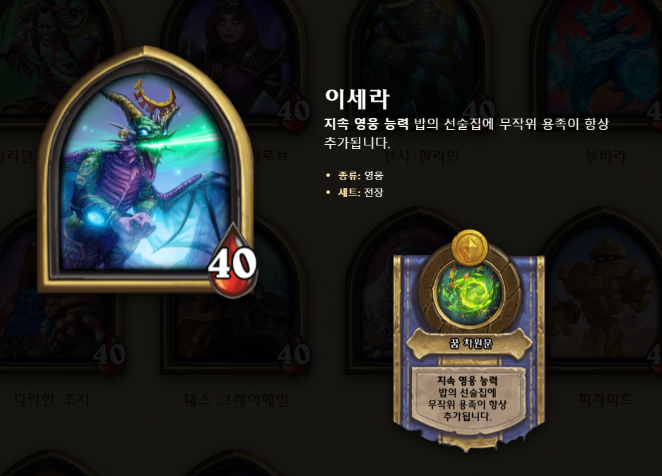이세라의 영웅 능력은 기존 "첫 밥의 선술집에 무작위 용족을 추가합니다" 에서 "항상 밥의 선술집에 무작위 용족이 추가됩니다."로 변경되었습니다. 즉, 리롤을 할 때도 용족이 반드시 1장은 추가되기 때문에 이전보다 용덱을 맞추기 수월해졌습니다. 특히 8 턴에 5 레벨을 찍고, 황금 카드로 6성 칼렉고스를 발견을 성공해야 하는 용덱과 적절한 시너지를 가지게 되었다고 생각합니다.
