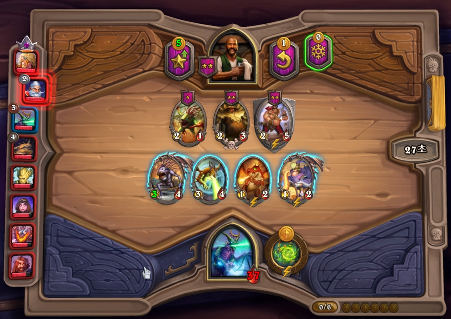 5 턴 하수인 상점입니다. 시간의 청지기를 구매하고 레벨업을 했습니다. 얼린 것은 토그왜글때문에 얼렸습니다. 문양수호자도 나쁘진 않지만, 그렇게 구매의사가 높진 않았습니다.