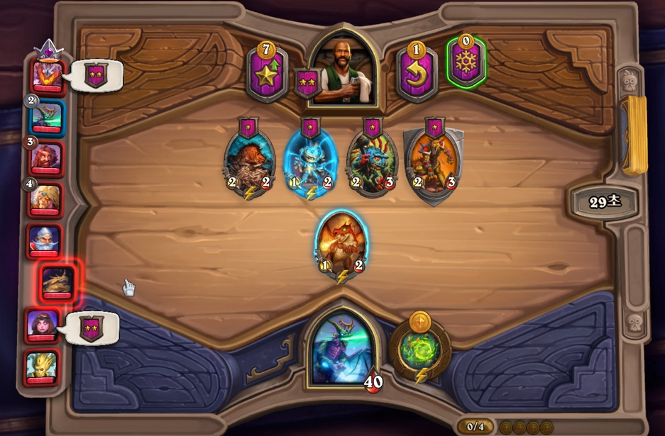 4 턴 하수인 상점입니다. 상점이 굉장히 아쉽네요. 그래도 용은 반드시 구매를 해주고, 남은 하수인은 상대(멀록 덱)를 보고 거목 눈 멀록을 구매했습니다. 상대가 혼합이나 다른 종족 덱이었으면 요호우거를 구매했을 것 같네요ㅇㅅㅇ;