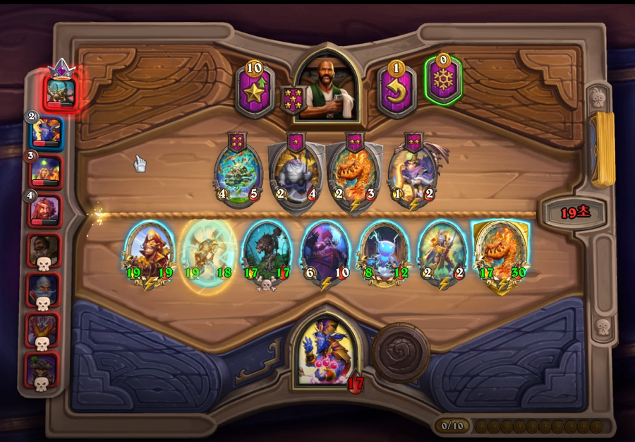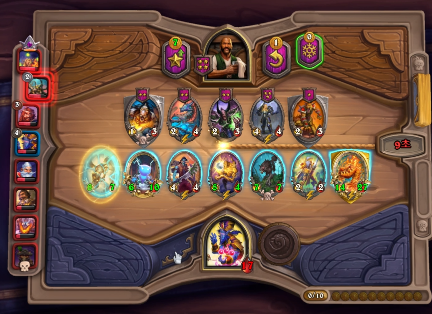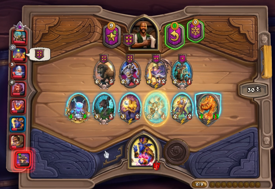 그나마 초반 가장 좋은 상황은 6턴(8골드) 전에 하수인 페어를 맞추고, 선상도박꾼을 가지고 있다면, 6턴(8골드)에 레벨 업 + 선상 도박꾼 판매 + 영웅 능력을 하는 상황이 좋겠네요. 이런 상황이 나오면 코스트가 딱딱 떨어지기 때문에 플레이어 입장에서 굉장히 기분이 좋죠. 또한 5발까지 성공한다면 우승플래그에 그나마 가까워 질 수 있겠습니다.