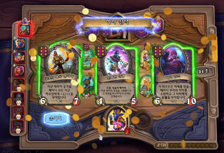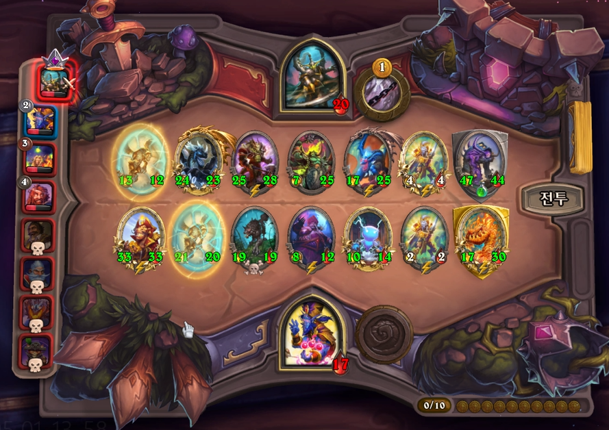 이런 경우는 저도 딱한번 나왔던 것 같고, 우승했던 기억이 있네요. 그렇지 않고는 순위 방어가 좀 힘들었던것같네요. 아무래도 초반에 두들겨맞는 경우가 많다보니 8턴 전에 체력이 10도 남지 않는 경우가 많았습니다. 그래서 개인적으로는1턴에 명인이 나왔으면 악마덱을 살짝 추천드리고 싶네요. 악마덱 같은경우, 1,2레벨에 오래 머무르면서 천천히 플레이해도 되기 때문에 그나마 시너지가 괜찮다고 생각합니다.