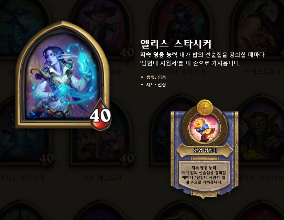 엘리스 스타시커의 영웅 능력은 밥의 선술집을 강화할때마다 '탐험대 지원서'를 내손으로 가져옵니다. 탐험대 지원서는 선술집 단계에 맞는 하수인을 발견할 수 있는 카드며, 원래는 3코스트였지만, 현재는 2코스트로 비용이 감소했습니다. 이로인해 엘리스는 남들보다 레벨업 타이밍이 빠르게 잡으면서 필드를 강하게 잡을 수 있었습니다.
