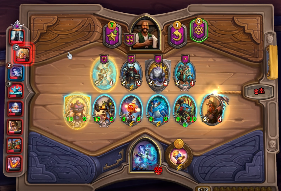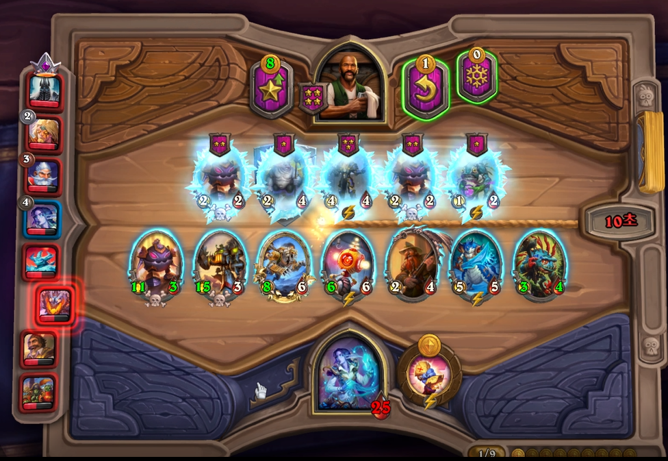 이렇게 빌드업해도 필드가 밀리지도 않고, 오히려 이기는 경우가 발생합니다. 탐험가 지원서가 한단계 높은 하수인이다보니 이득 교환을 잘보는 경우가 많습니다. 그래서 체력관리만 잘되면 8턴에 6레벨을 찍어도 좋습니다ㅇㅅㅇ;