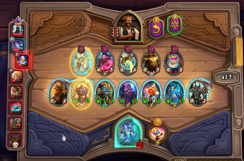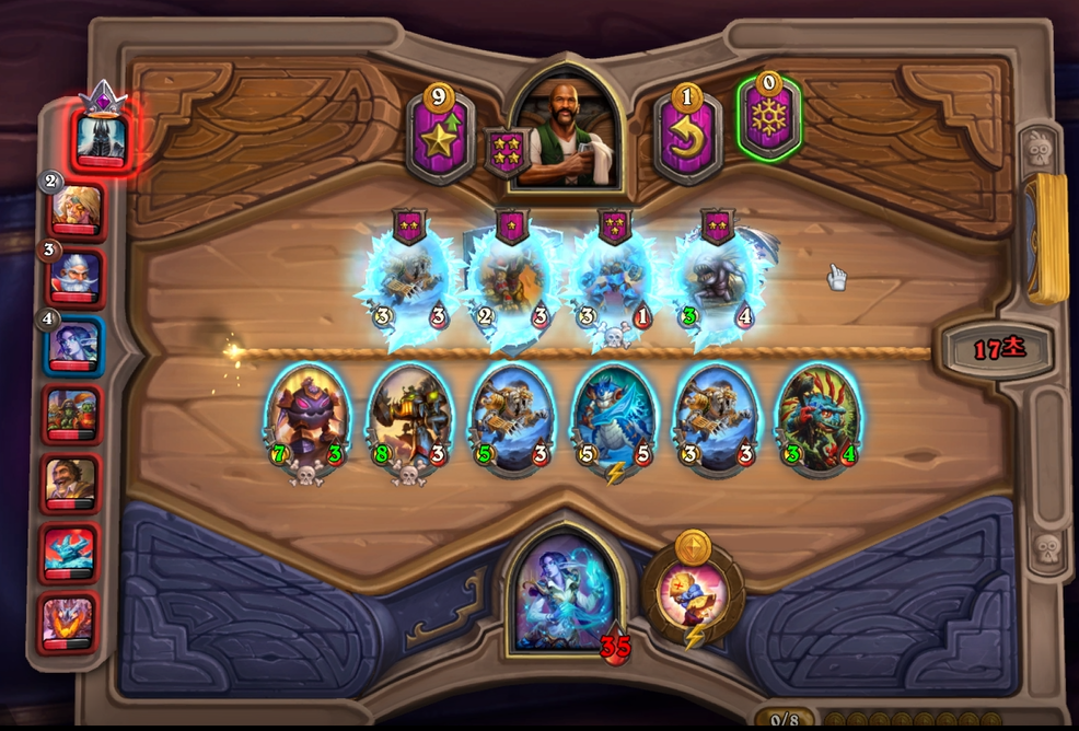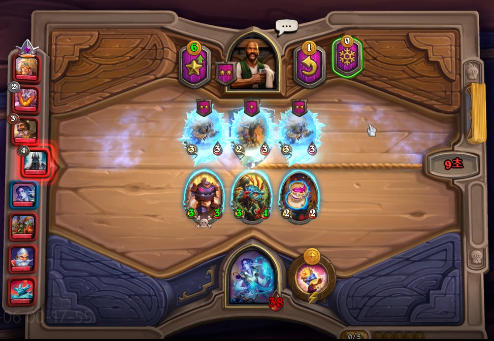 4턴에 황카각이 나왔지만, 레벨업 + 하수인 판매 + 탐험가 지원서를 썼습니다. 어차피 당장 만들수 없고, 다음턴에 하수인 2개 구매하고, 다다음턴에 4레벨을 찍을 수 있기 때문에 얼려두었습니다. 당장 사면 단점이 골드를 조금씩 낭비가 되기 때문에 최대한 경제적으로 운영하는 것이 좋습니다.