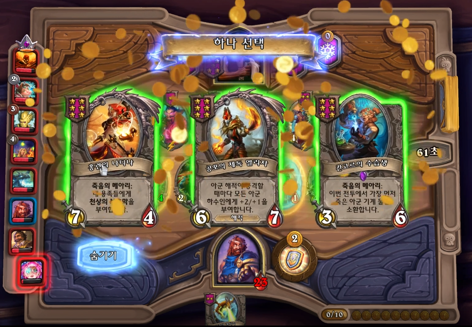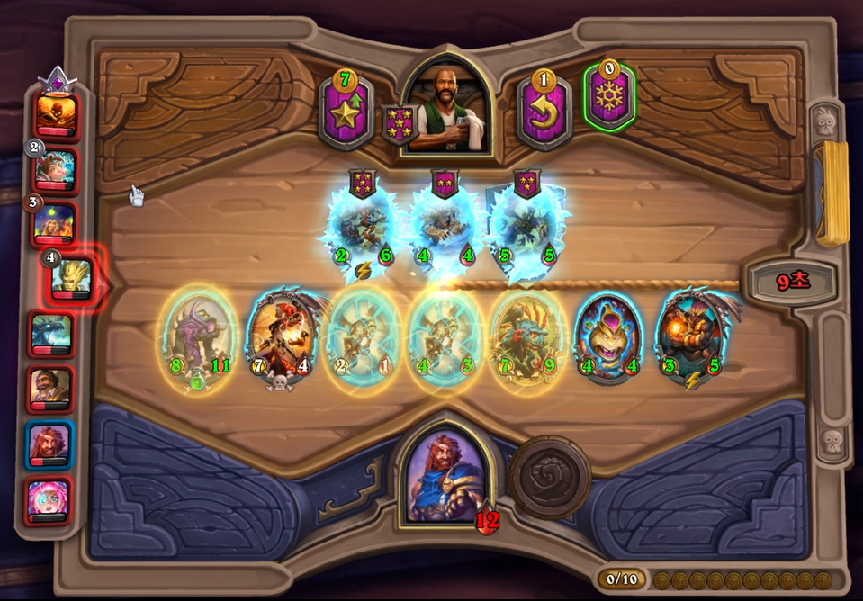 6 턴(8 골드) : 하수인 2개 구매 + 영웅 능력(가급적 리롤 X)
