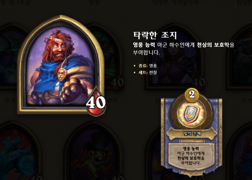 타락한 조지의 영웅 능력은 2골드로 아군 하수인에게 처상의 보호막을 부여합니다. 처음 출시했을때는 영웅 능력의 비용이 4골드였으나 3골드로 버프되고, 그래도 유저들이 쓰지 않아 최근에 2골드로 다시 한번 버프를 받았습니다. 멀록, 치명적인 포자, 혹은 떡대 하수인에게 천상의 보호막을 부여하여 최소 2인분 역할을 만들 수 있어 필드 개입력이 전장 영웅들중 상위권이라고 생각합니다.