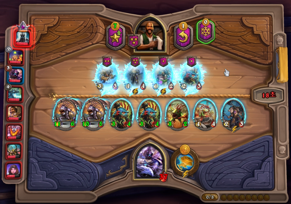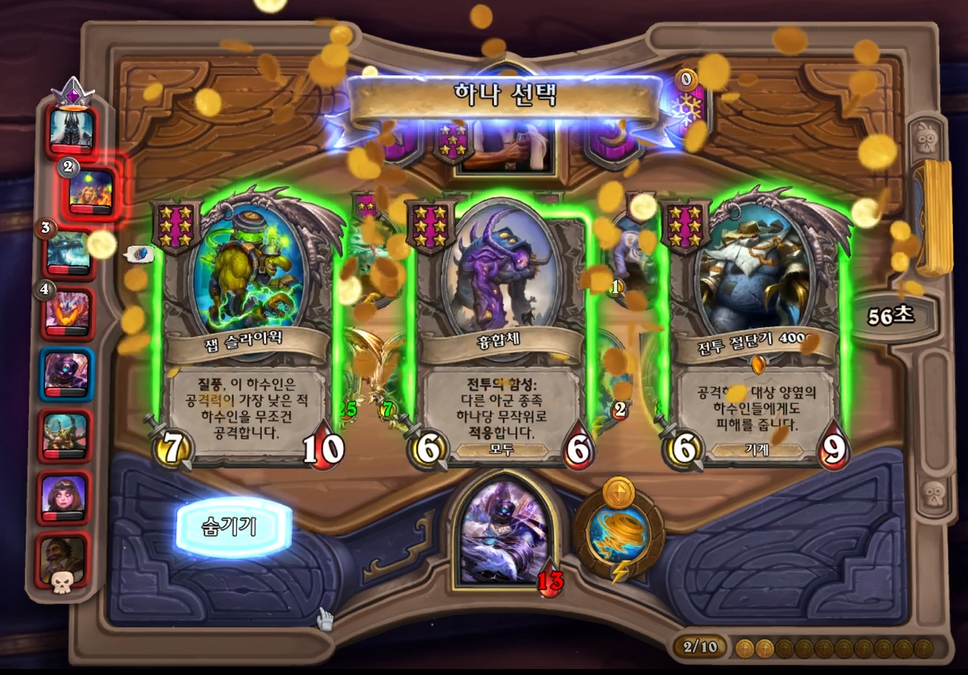 8턴에 저는 영웅 능력을 믿고, 빠르게 5레벨을 찍고 페어가 풀려 흉합체를 찾았습니다. 그 뒤로는 그냥 빛송곳니, 버프류들을 찾았습니다.