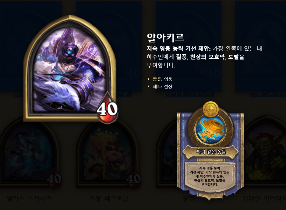 알아키르는 전투시작시, 가장 왼쪽에 있는 내 하수인에게 절풍, 천상의 보호막, 도발을 부여합니다. 거의 3턴까지는 리치왕과 마찬가지로 최강의 필드 개입력 영웅 능력이기 때문에 전투에서 지는 경우가 없습니다. 다만, 리치왕과 달리 죽음의 메아리 시너지와는 적고, 후반을 보면 배치가 강제되는 면이 있어 장단점이 명확한 영웅이라고 생각합니다. 그렇지만 언제나 천상의 보호막은 1인분이상이기 때문에 지금 영웅 티어로는 1.5~2티어 된다고 생각합니다.