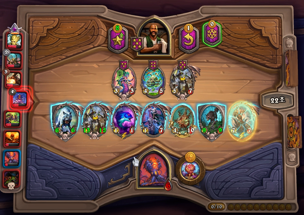 느조스 운영의 경우, 기본적인 레벨업 타이밍은 4,7,9골드에 하시면 되고, 특별한 운영법이 없습니다.ㅇㅅㅇ; 느조스의 피조물, 콰광로봇, 고대의 파수꾼등 가치 있는 죽음의 메아리 하수인들을 구매해서 전투 혹은 골드 이득을 보면서 후반을 도모해야겠습니다.