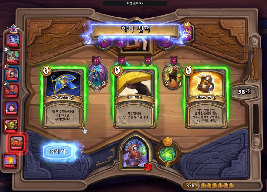 6 턴 하수인 상점입니다. 6턴에 잿빛가지처럼 평범한 영웅들은 상대를 보고, 레벨업 각을 재야합니다. 생대가 4레벨을 찍으면 그에 맞게 똑같이 업을 찍어주시고, 상대가 업을 안하면 필드를 채우고 안전하게 하수인을 채워주면 됩니다. 이 때,4성 발견을 그냥 해도 되지만, 그러면 느조스가 안 터질 확률도 있고, 필드도 한자리가 비워지기 때문에 저는 한 턴 더 얼려놓았습니다.