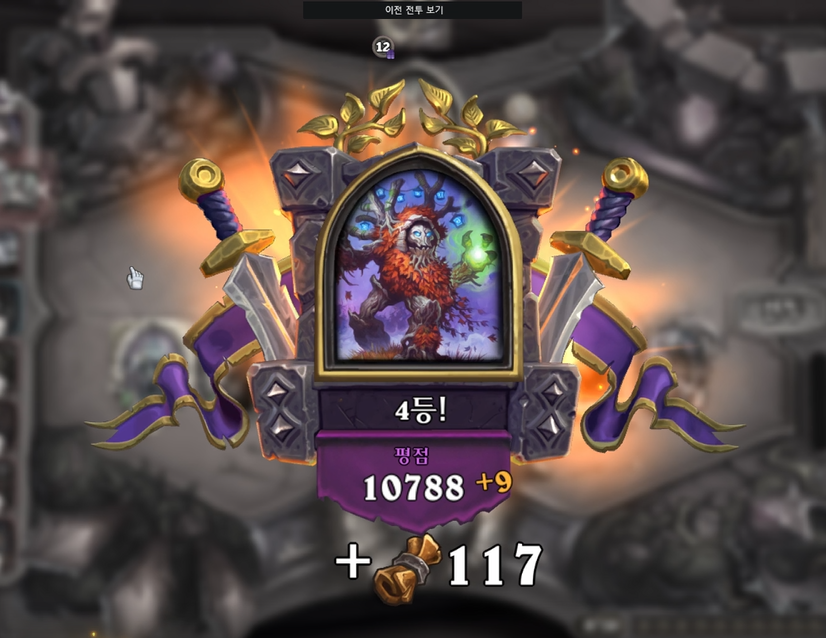 이 뒤로는 크게 설명드릴 게 없어 많이 생략했습니다. 결국 야수, 기계, 잡탕 덱 전환을 이루는 것이 이상적인 우승 플래그인데, 후반 상점운이 좋지 못했고, 워낙 사기 친 놈들이 많아 4위로 마감했습니다.