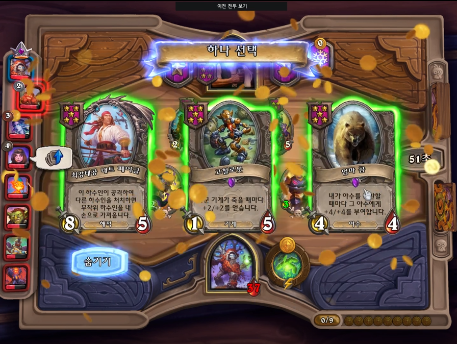 7 턴 하수인 상점입니다. 상점에 쥐 때가 있어 엄마곰을 선택했습니다. 나쁘지 않네요. 이러면 다음 턴에 레벨업 + 멀록 팔고, 쥐 뗴를 구입해주면 완벽합니다.