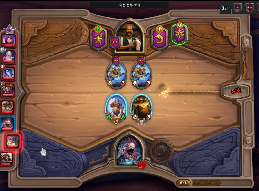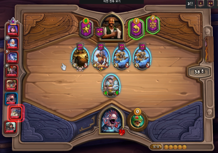5턴 하수인 상점입니다. 조금 상점이 섭섭하네요.. 3레벨을 찍고, 1성 정령을 구매했습니다.