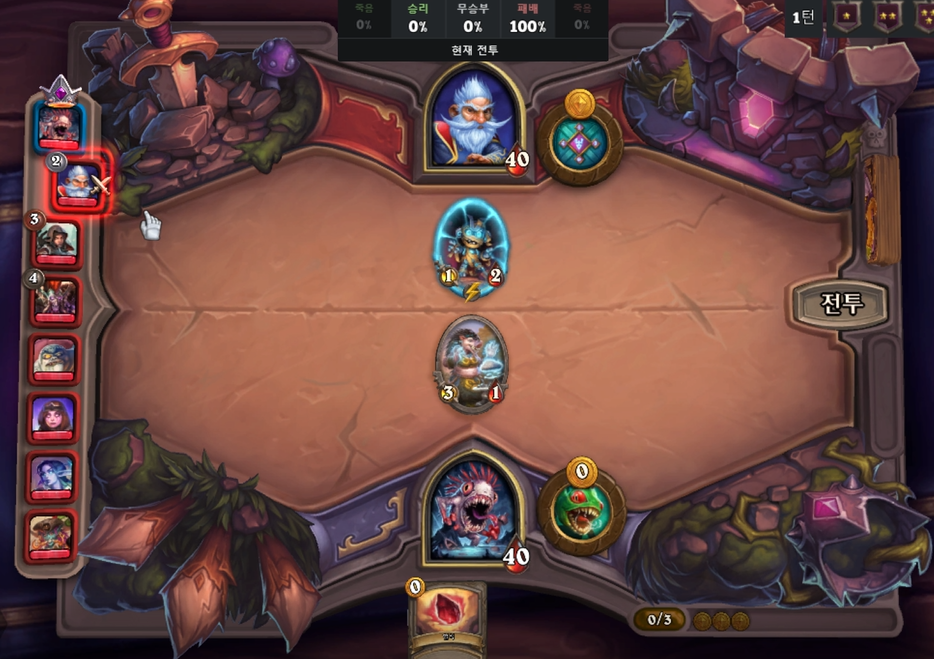 1턴 전투는 아쉽게 패배했습니다. 혈석을 썼으면 무승부였을텐데, 제가 실수했네요.어차피 무타누스 영웅 능력으로 스탯을 옮길수 있어 혈석을 1턴에 쓰는 것이 좀 더 바람직했겠다는 생각이 들었습니다ㅋㅅㅋ;