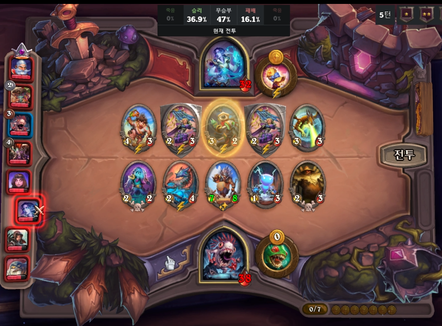 *무타누스의 영웅 능력은 3턴(5골드)에서 사용 후, 6~7턴때부터 사용하시면 됩니다. 영웅 능력 자체가 간단하고, 레벨업 타이밍도 일반적인 국룰 턴(2,5,7턴(4골드,7골드,9골드))으로 잡으시면 되서 쉽고 강력한 영웅입니다.ㅎㅎ;