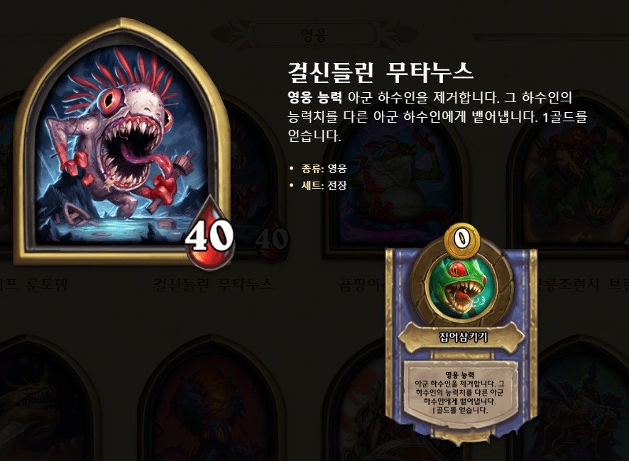 무타누스의 영웅 능력은 아군 하수인을 제거하고, 그 하수인의 능력치를 다른 (무작위)아군 하수인에게 부여하며, 1골드를 얻습니다. 무타누스의 경우, 초반에 키워놓은 하수인, 버프류 하수인에게 영웅능력을 사용함으로써, 그 하수인의스탯을 필드에 남겨 놓을 수 있다는 장점이 상당히 좋다고 생각합니다. 물론, 초중반에 사용 빈도가 적다는 단점이 있으나, 중반(대략 6~7턴)부터 0코스트로 버프된 스탯을 매턴 1회씩 옮길 수 있으며, 이로 인해 버프 손해가 거의 없어 상위권 티어 영웅이라고 생각합니다.