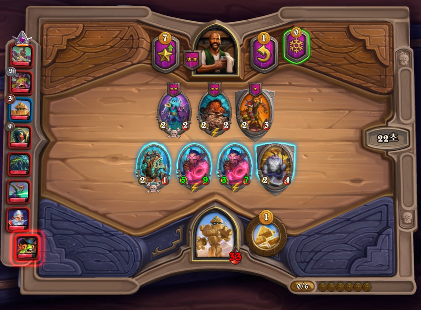 6턴 하수인 상점입니다. 플레이 순서는 영웅 능력-> 황금 분노의 명인 -> 부릉이 발견-> 임프 두목을 구입했습니다. 체력이 무려 24인 분노의 명인이 매우 든든하네요!