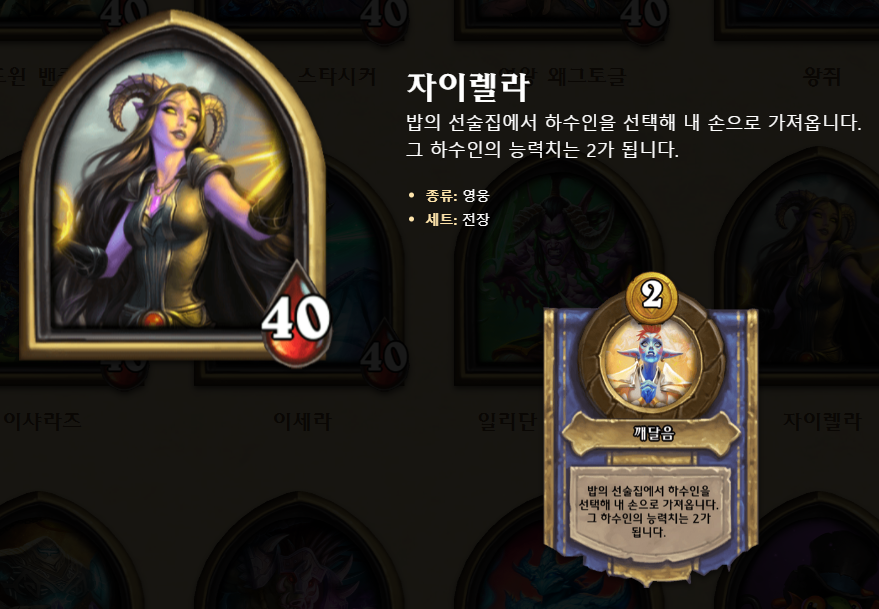 자이렐라의 영웅 능력(비용 2)은 밥의 선술집에서 하수인을 선택해 내 손으로 가져옵니다. 그하수인의 능력치는 2/2가 됩니다. 어떻게 보면 요그샤론과 비슷하나 하수인을 선택할 수 있어 리스크(운)적인 요소가 적은 대신, 스탯이 2/2로 고정이 되었다고 생각하시면 되겠습니다. 초반부터 후반까지 영웅 능력을 활용하기 좋으며, 1턴에 토큰시작 시, 토큰의 기본 스탯보다 높아지며, 선상 도박꾼에게 쓰면 1골드가 세이브 되며, 기존 스탯이 2/2인 느조스의 피조물, 찻잔,기계 사부, 청동 감시자, 빛송 혹은 브란, 얼굴없는 선술집 손님 등에게 쓰면 스탯 손실 없이 골드를 아낄 수 있겠습니다.