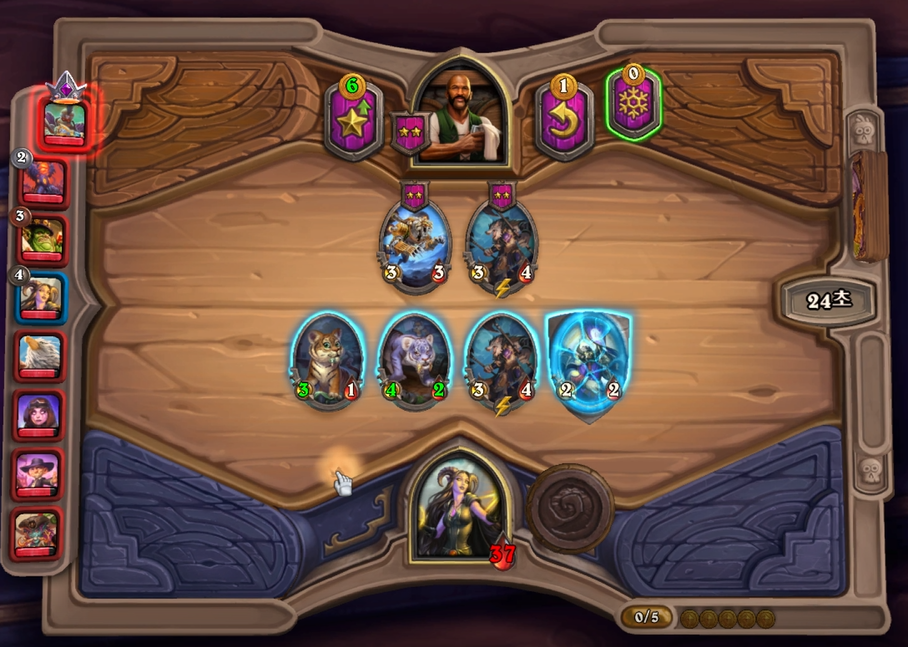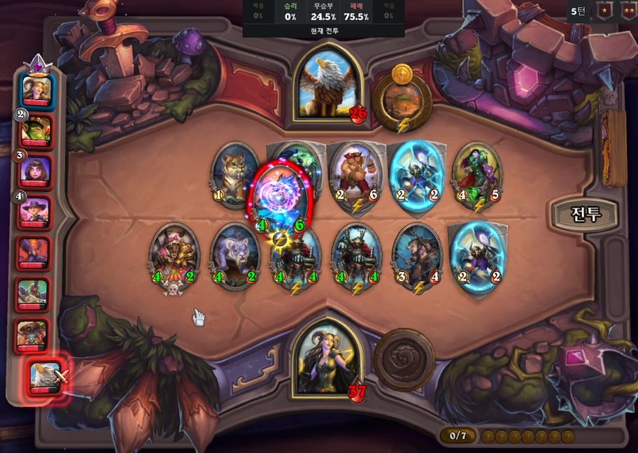 5 턴(7 골드) : 2/2 하수인 판매 후, 하수인 2개 구매 + 영웅 능력(상점이 좋지 않으면 그냥 하수인 2개만 구매)