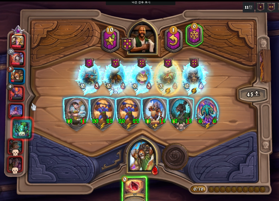 거프 룬토템에 플레이리뷰는 좀 더 나은 운영을 했을 때 자세히 해보도록 하겠습니다. 아래 와 같이 보통 1~4성까지의 각 하수인에게 버프를 주면서 나름 필드가 강력해졌으나, 아쉽게 빛송곳니 혹은 브란같은 하수인을 찾지 못해 아쉽게 11턴에 그것도 더미에게 패배했었습니다ㅎㅎ;