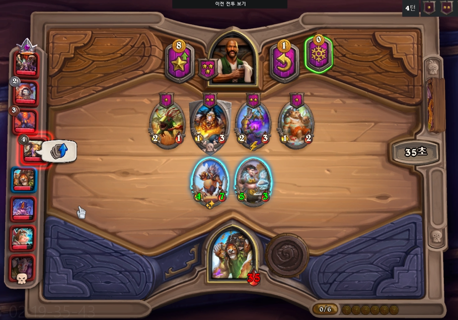 5 턴(7 골드) : 하수인 2개 구매 + 영웅 능력(되도록 3성 하수인 구매)