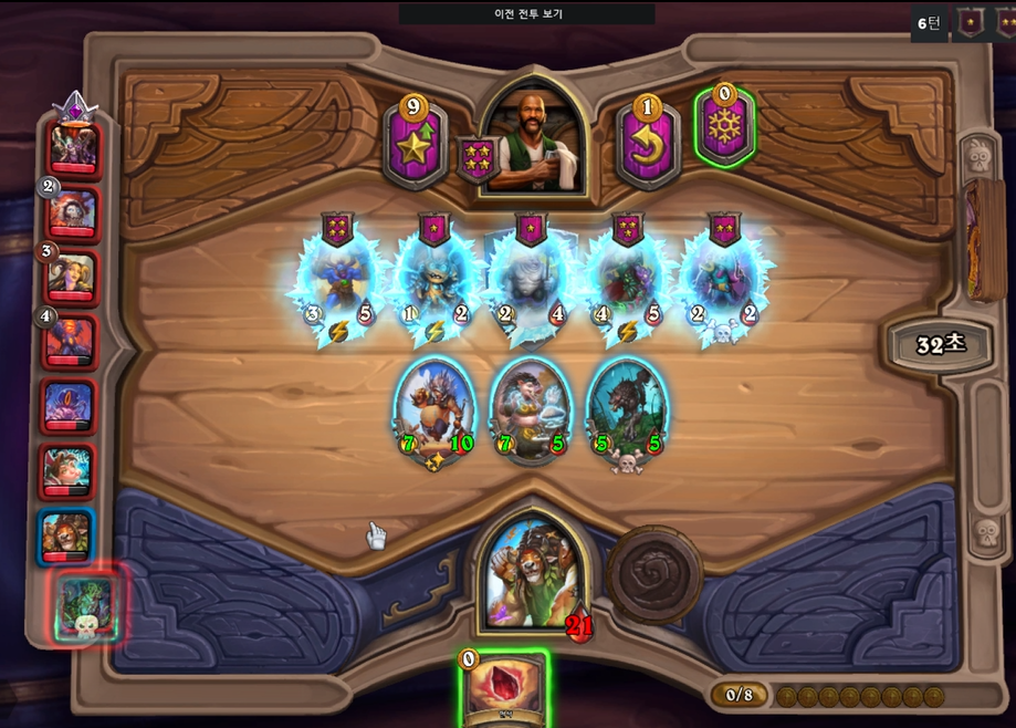 8 턴(10 골드) : 레벨업 + 영웅 능력(쳐력 여건이 좋지 않으면 레벨업 x )