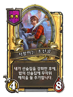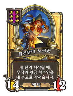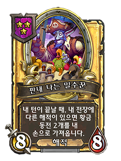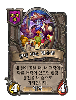 - [4단계, 해적] 내 손으로 카드를 가져온 후에, 다른 무작위 해적에게 +1/+1을 부여합니다.