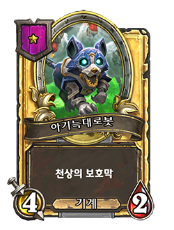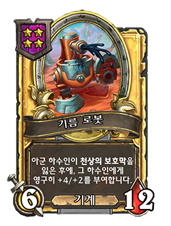 - [4단계, 기계] 아군 하수인이 천상의 보호막을 잃은 후에, 그 하수인에게 영구히 +2/+1을 부여합니다.