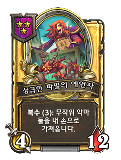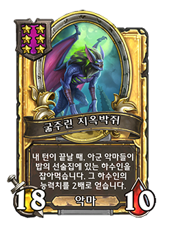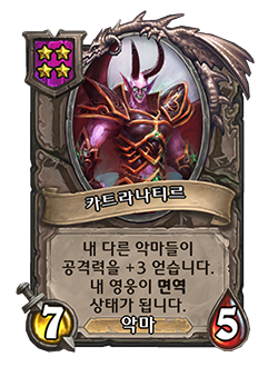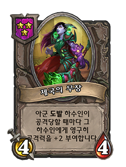 - [4단계, 악마] 내 다른 악마들이 공격력을 +3 얻습니다. 내 영웅이 면역 상태가 됩니다.