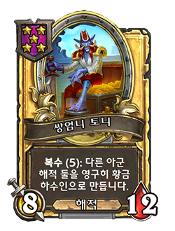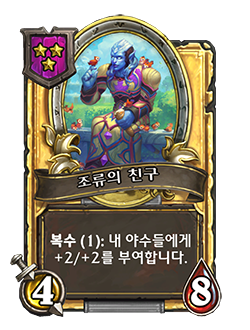 - 무작위 아군 하수인 셋에게 +1/+1을 부여합니다. (선술집 단계가 5단계일 때 강화됩니다.)