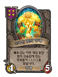 - [4단계, 정령] 복수 (2): 이번 게임 동안 밥의 선술집에 있는 정령들이 +1/+1을 얻습니다.