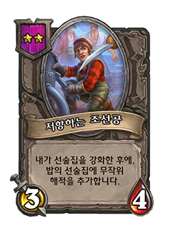 - 무작위 아군 하수인에게 +1/+1을 부여합니다. (선술집 단계가 3단계일 때 강화됩니다.)