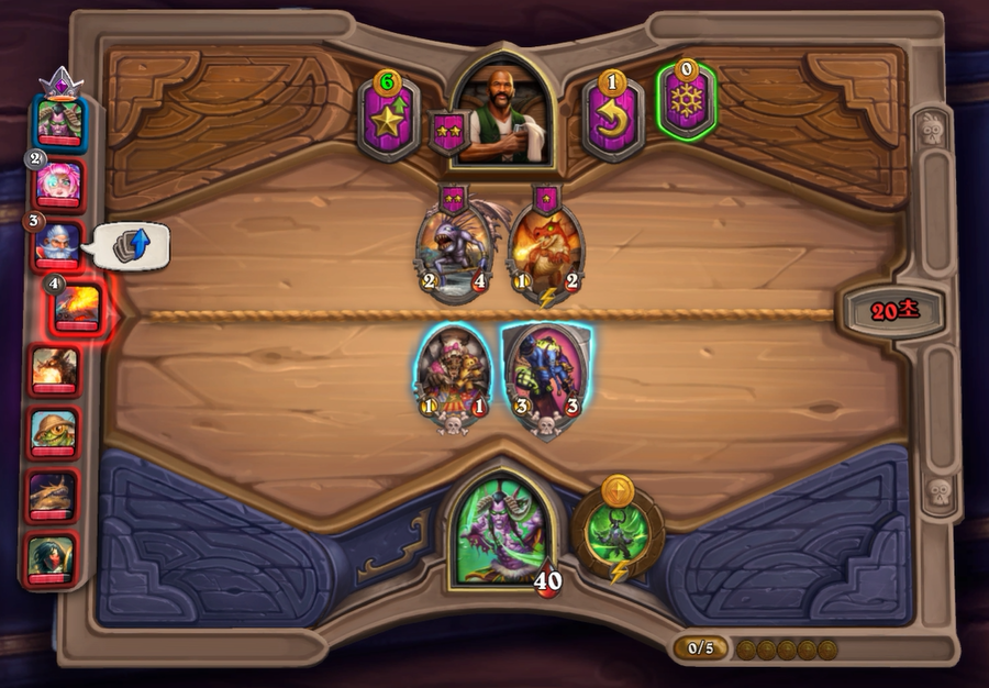 5턴 하수인 상점입니다. 하이애나를 구입하고 레벨 업했습니다. 보통은 하이애나를 가장 오른쪽 배치하지만, 영웅 능력때문에 어쩔수 없이 할머니를 오른쪽 배치했습니다. 영웅능력을 오른쪽 on/off가 있으면 좋겠습니다.