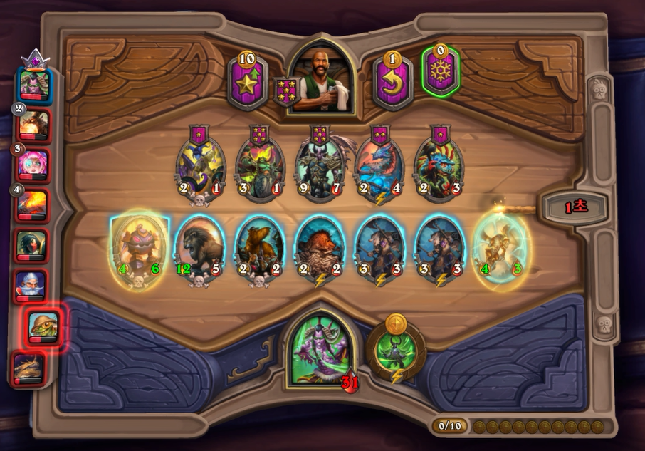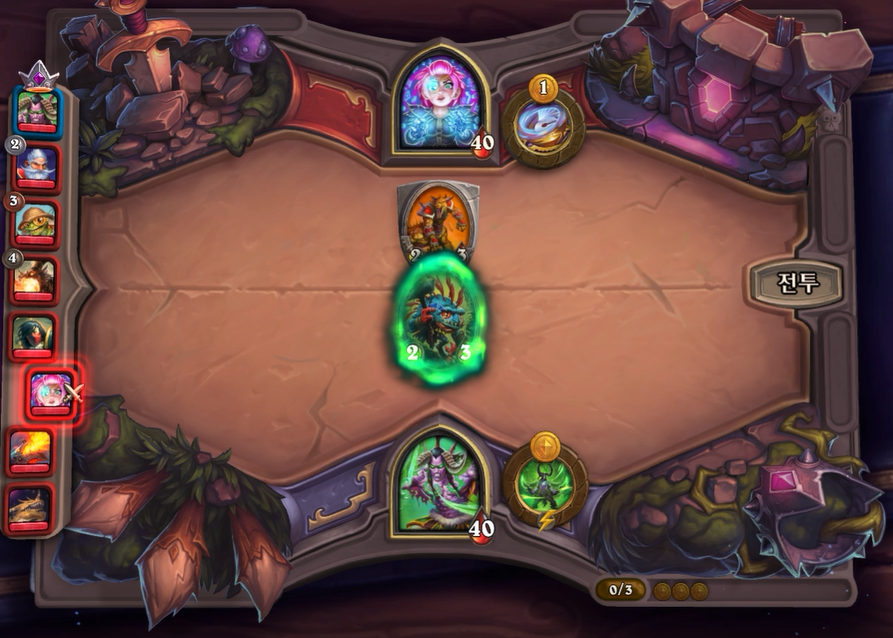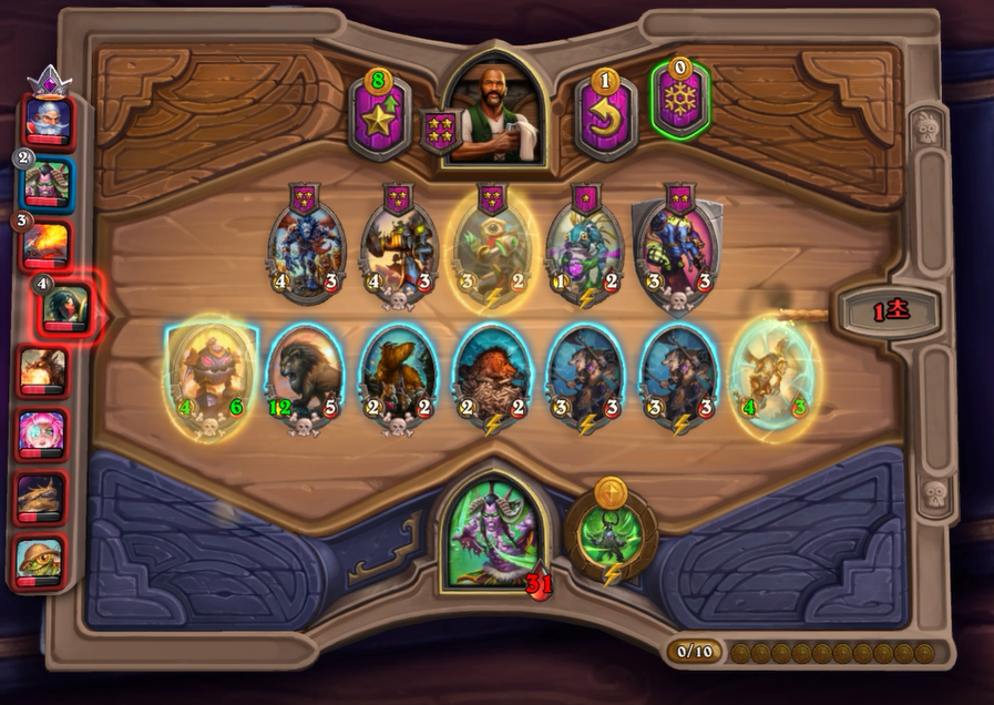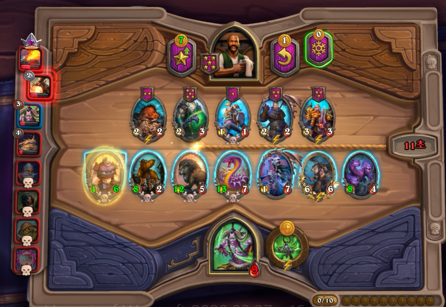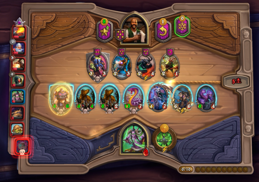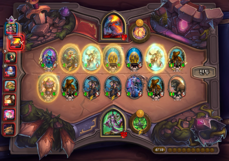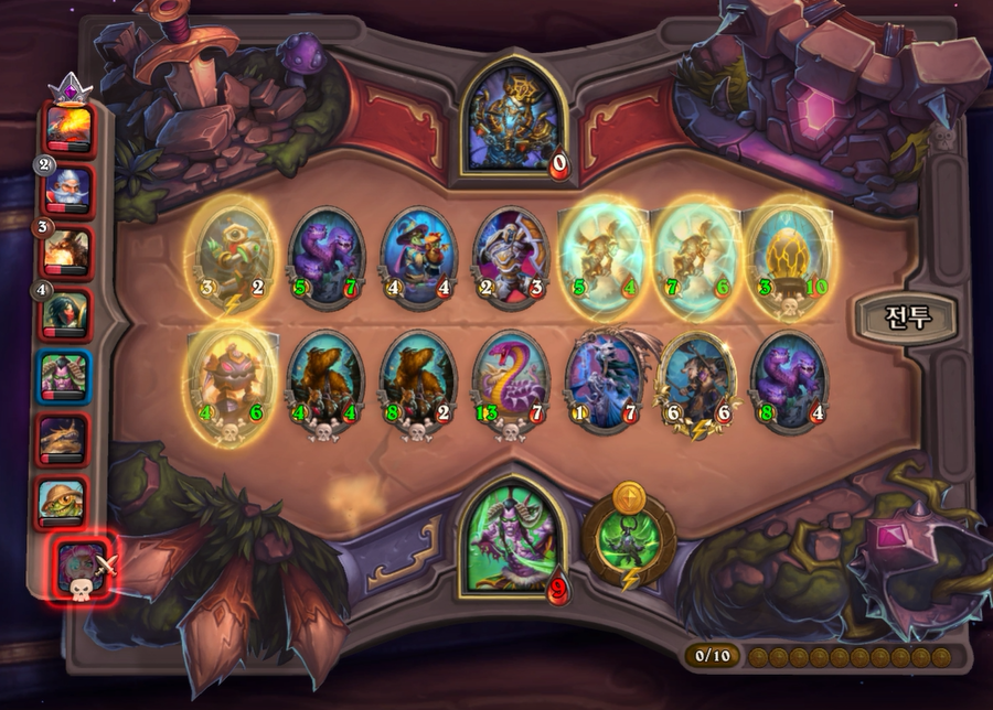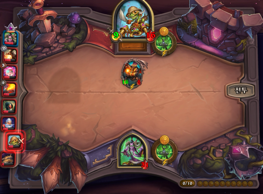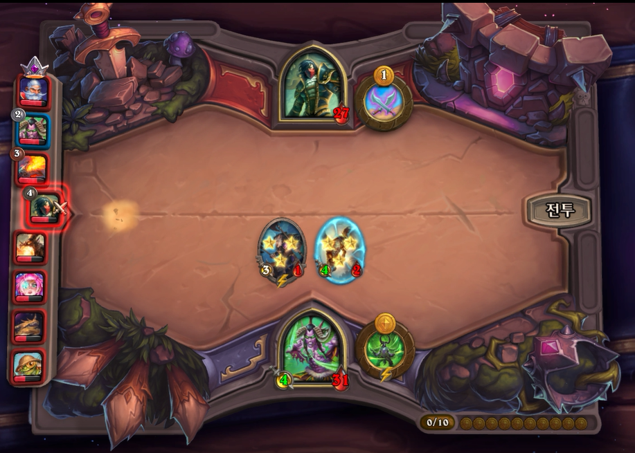 10턴 하수인 상점입니다. 다행히 데스윙이라 한번에 죽지는 않겠다고 생각했습니다.이렇게 히드라가 없고, 영웅 능력 때문에 강제로 사바나를 오른쪽 배치할 수 밖에 없었습니다. 이제는 선공이 다소 힘빠지는 타이밍이라고 생각했습니다.