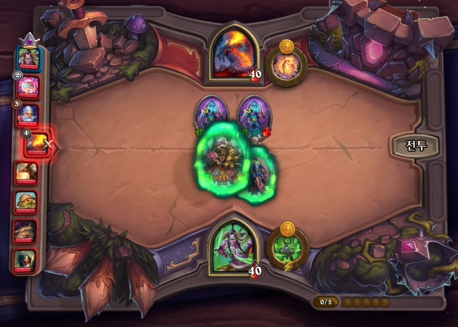 4턴 전투는 상대가 밀하우스이기 때문에 일반적으로 선공권을 뺐기지만, 일리단의 영웅 능력 덕에 4데미지 밖에 맞지 않았네요.