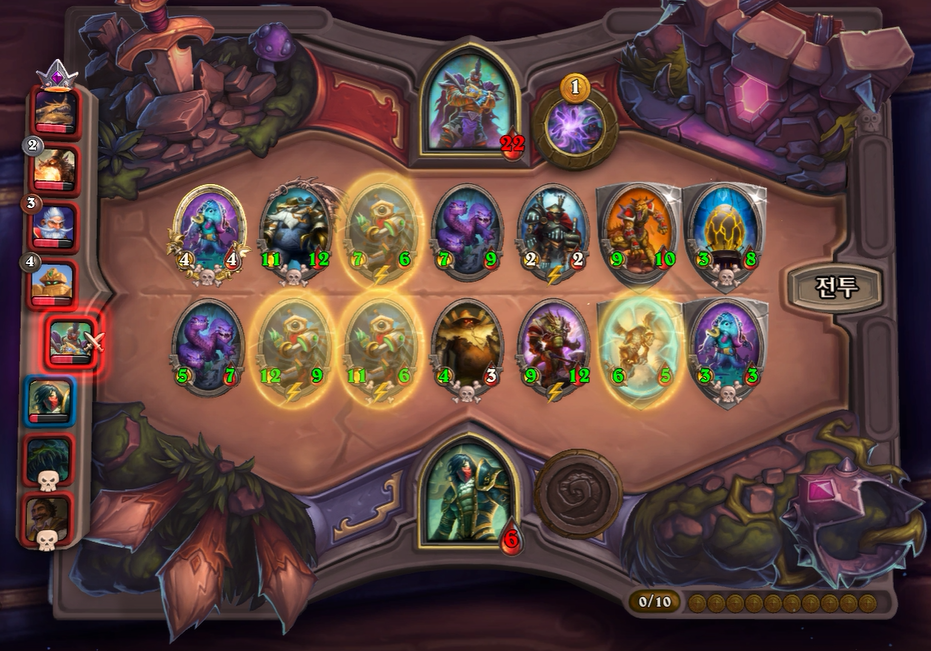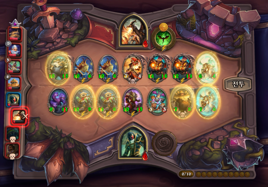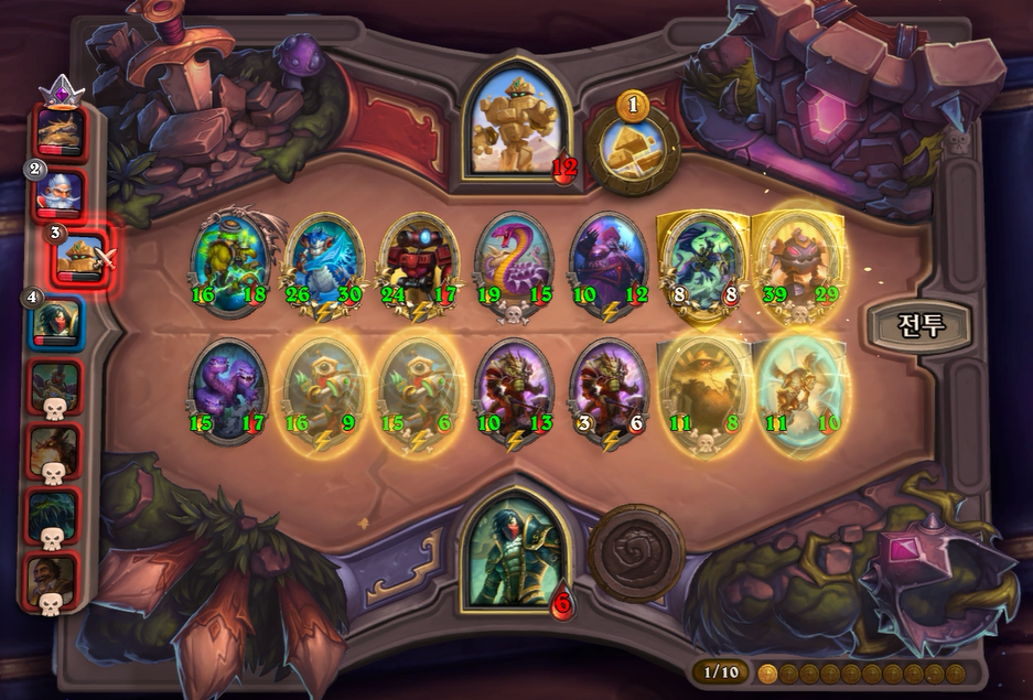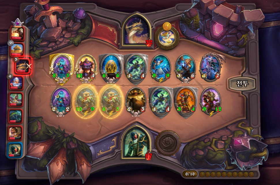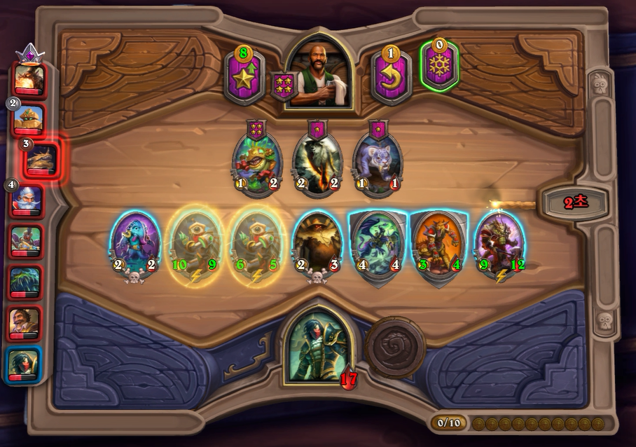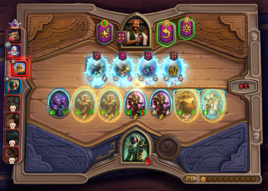 10턴 하수인 상점입니다. 체력을 많이 잃었지만, 벤클리프는 갈수록 쎈진다고 생각하고 플레이해야 합니다. 이번 상점에서 청동 감시자가 떴고, +3/+3 버프도 감시자에게 줬습니다. 최대한 버프는 히드라가 뜰 때까지 골고루 주는것이 좋습니다.
