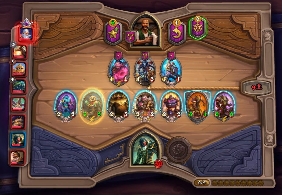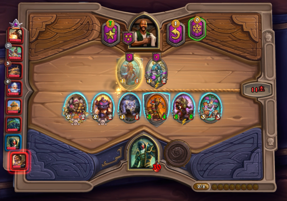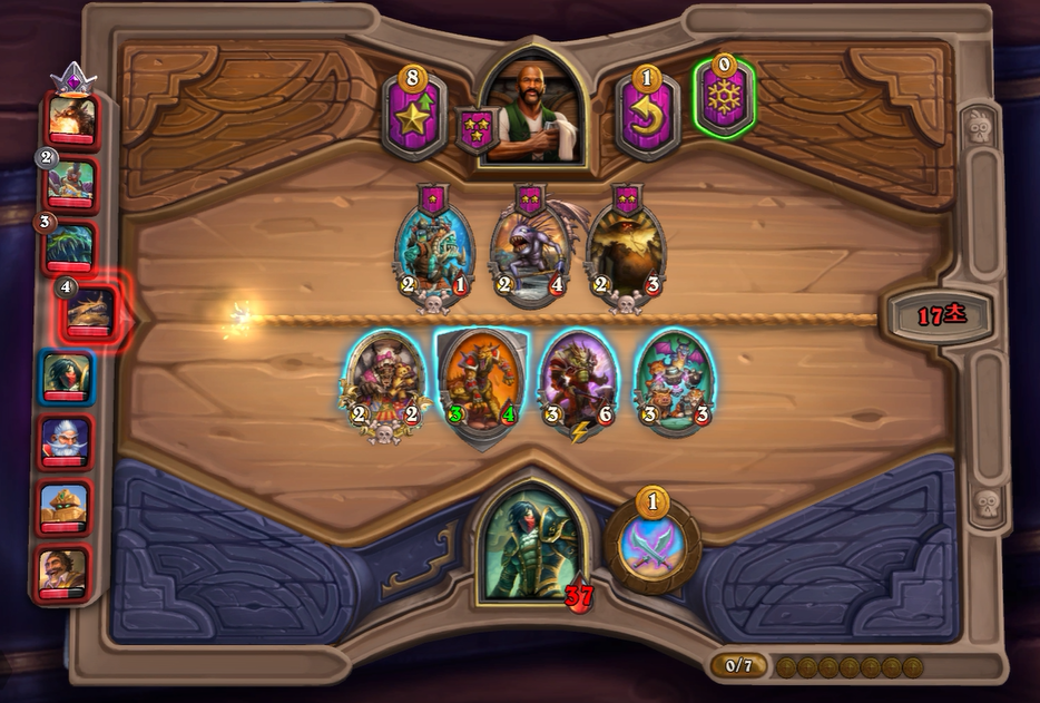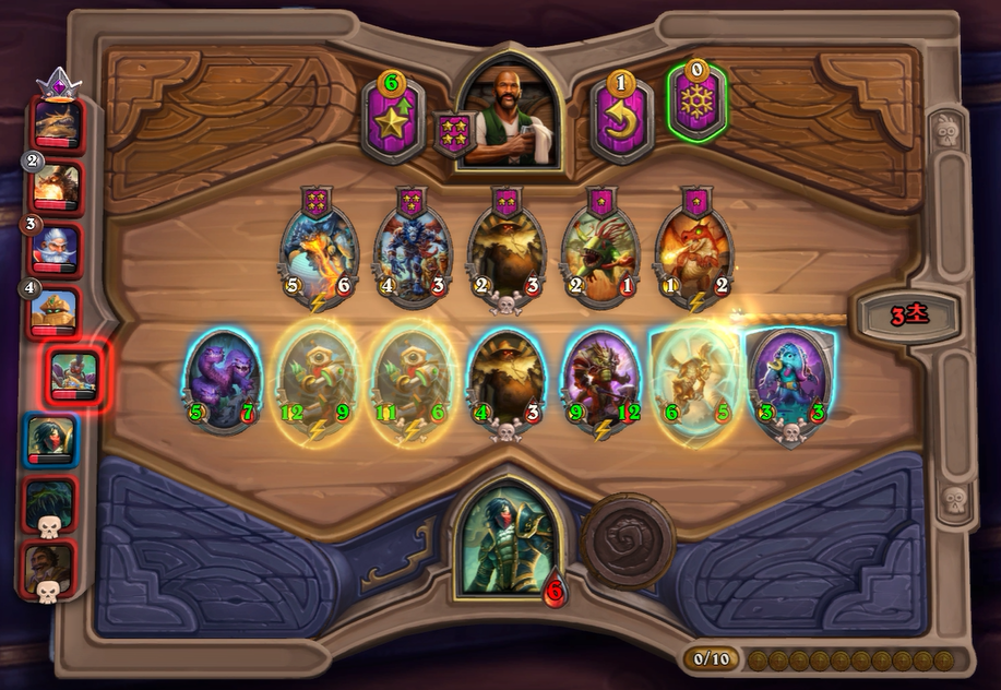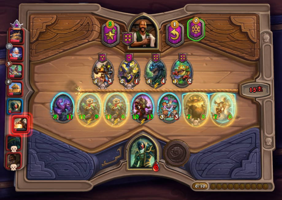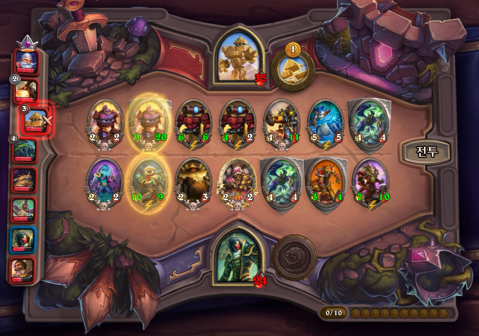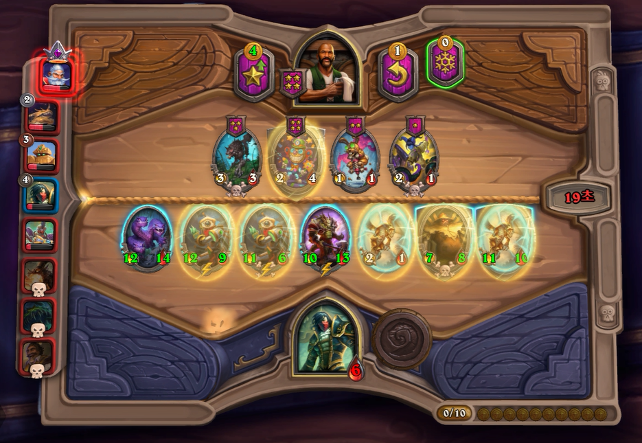 10턴 하수인 상점입니다. 체력을 많이 잃었지만, 벤클리프는 갈수록 쎈진다고 생각하고 플레이해야 합니다. 이번 상점에서 청동 감시자가 떴고, +3/+3 버프도 감시자에게 줬습니다. 최대한 버프는 히드라가 뜰 때까지 골고루 주는것이 좋습니다.