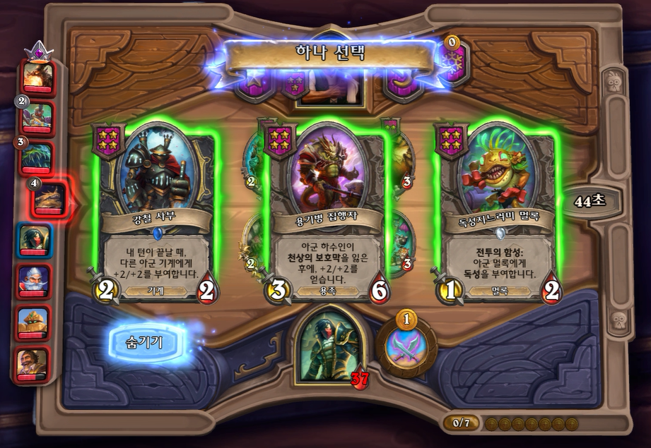 5턴 하수인 상점입니다. 레벨 업 + 황금 인자한 할머니를 통해 히드라를 발견하려고 했는데, 아쉽게 뜨지 않았습니다. 사부도 좋지만, 스탯적으로 무난한 용기병 집행자를 구입했습니다.