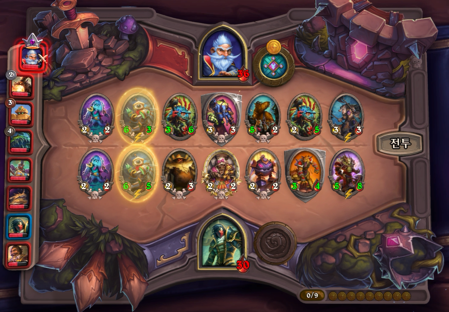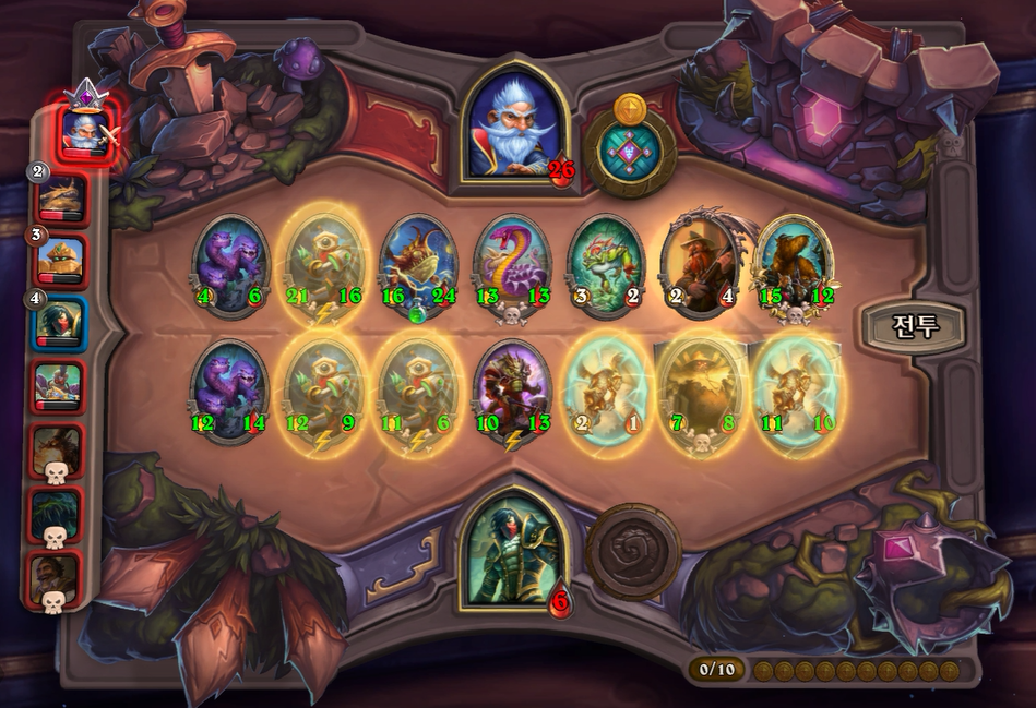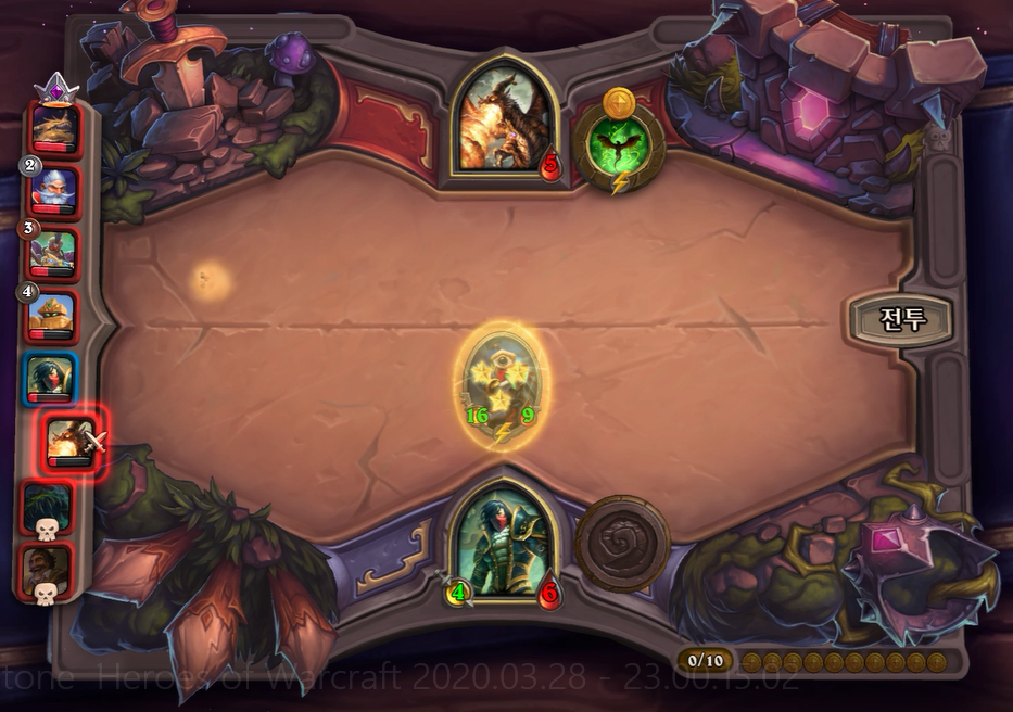9턴 전투 입니다. 상대는 사실상 죽메기계 덱 완성을 했었습니다. 체력 6으로 아슬아슬하게 살았는데, 노즈도르무가 사실상 우승이라고 생각했습니다. 아마 죽었으면 억울할 뻔했네요!